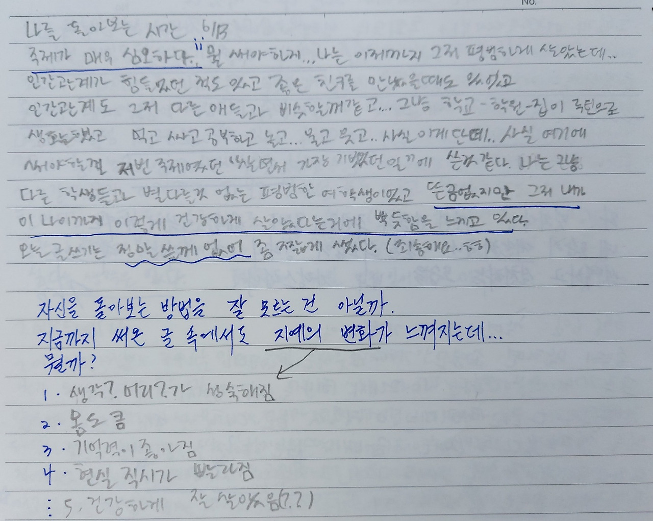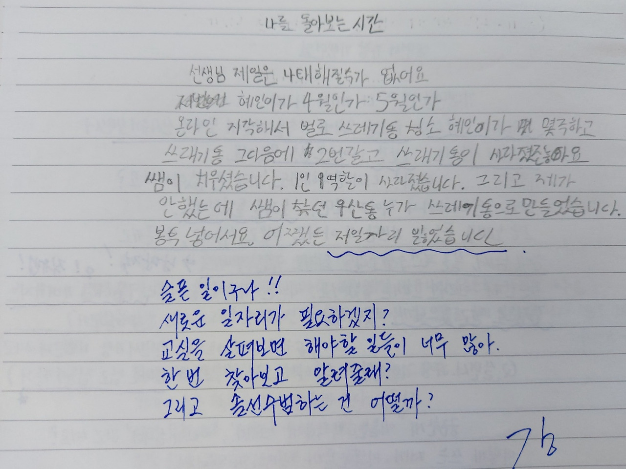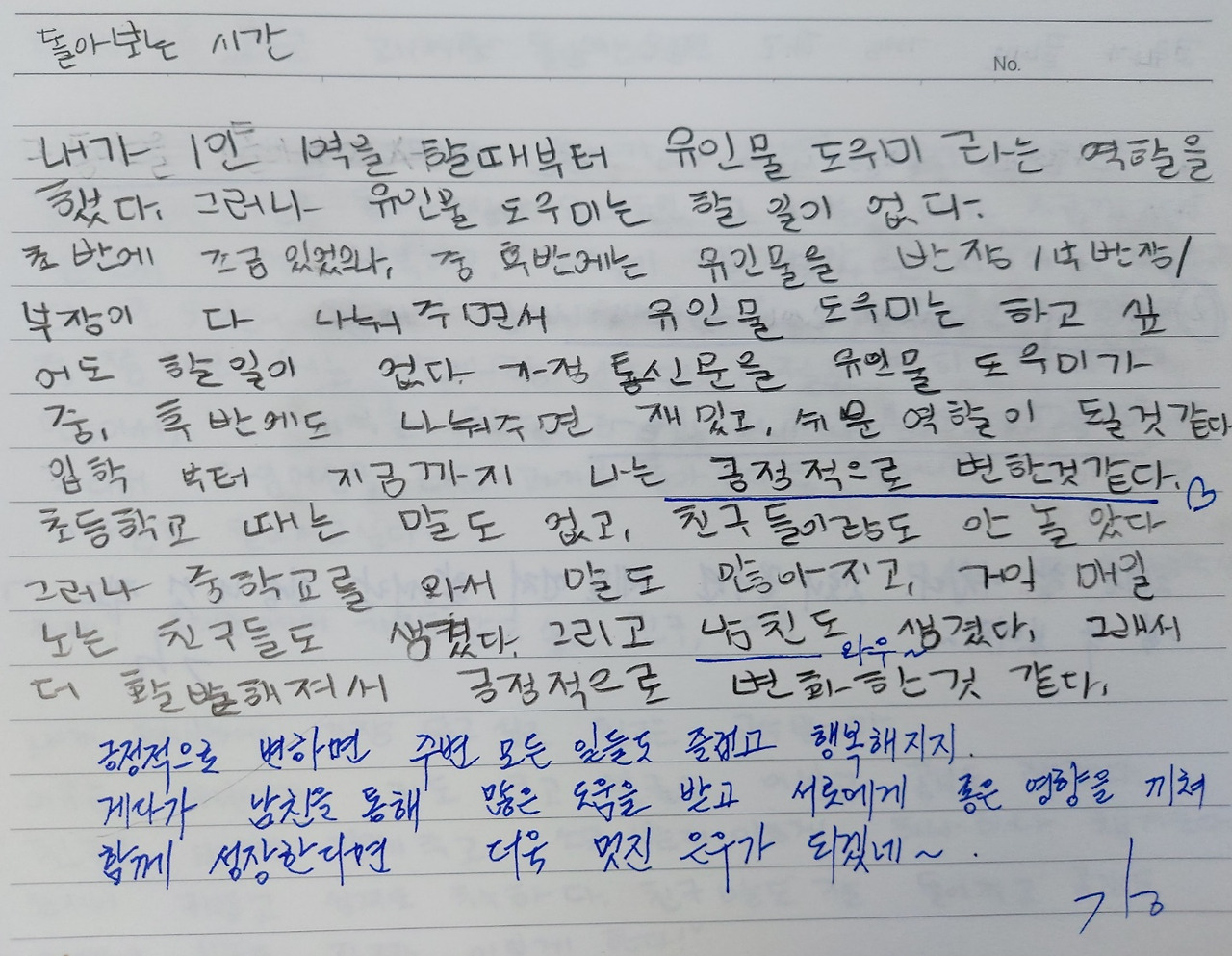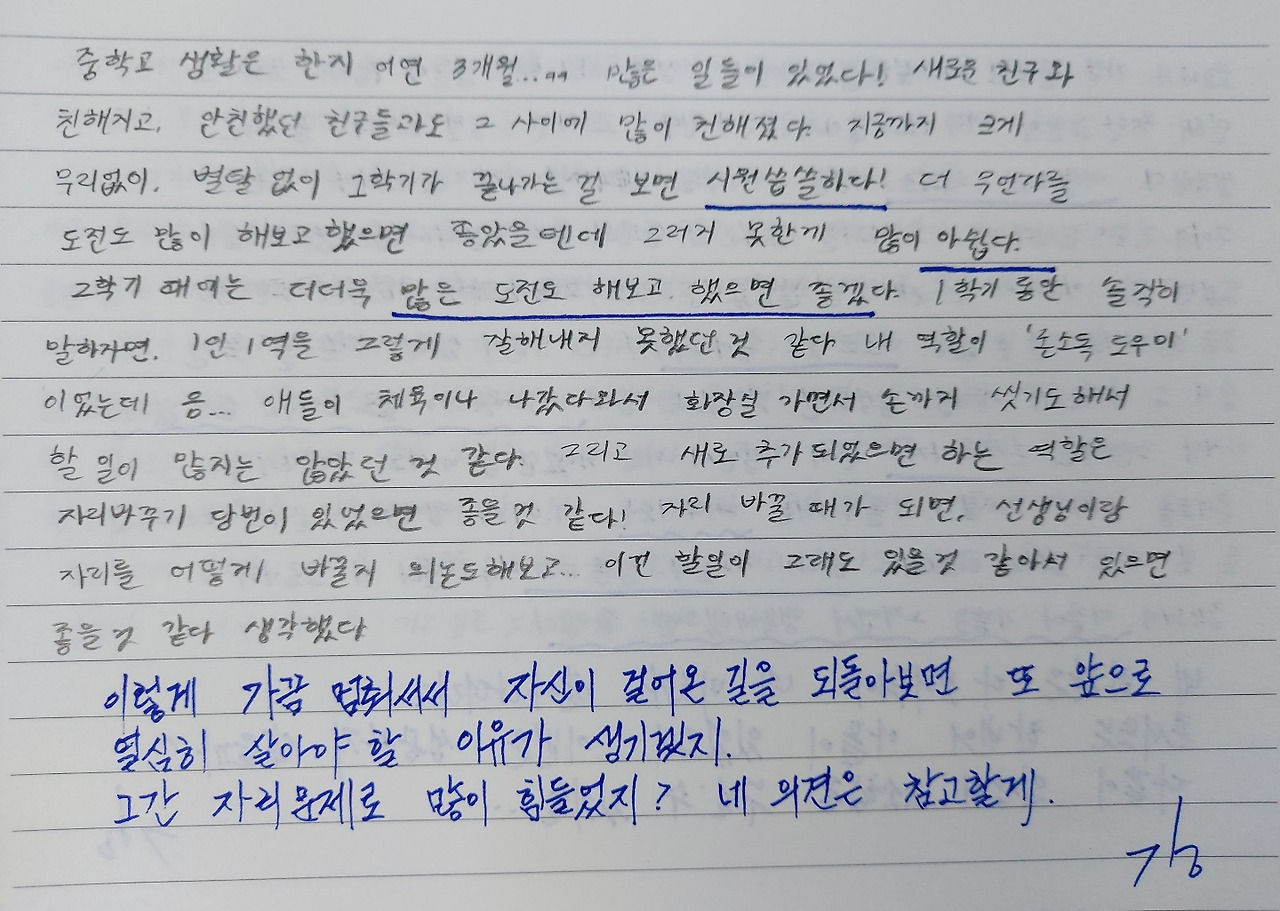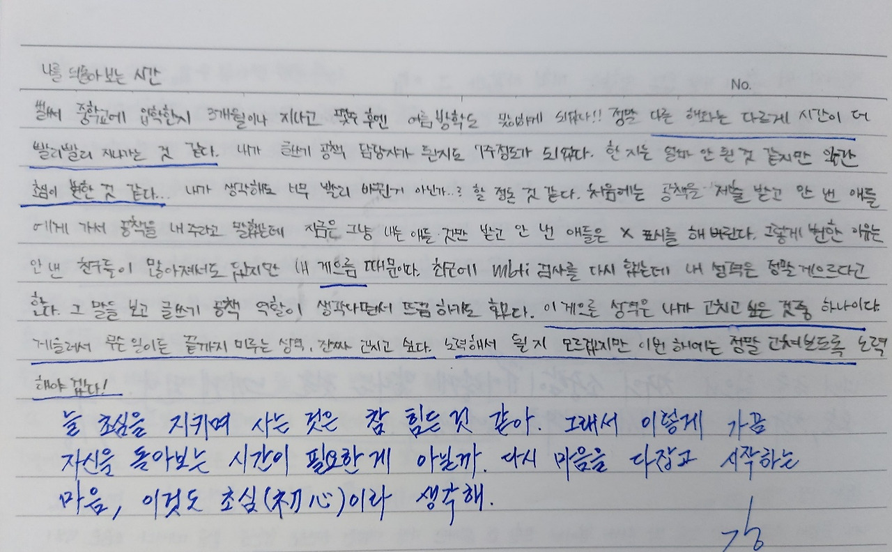 “내가 처음 글쓰기를 썼을 땐 처음 중학생이 되고 쓴 것이니 일기처럼 쓴 것 같다. 하지만 초등학생 때 일기 쓸 게 없을 때 주제를 골라 쓴 적이 있어서 앞으로는 더 잘 쓸 수 있을 것 같다. 그리고 처음엔 되게 중학교가 선배들이 많고 무서운 줄 알아서 핸드폰도 안 가져오고 말도 잘 못 걸었는데 지금 보니 그렇게 힘들고 심각하진 않았던 것 같다. 중학교에서는 행동 하나하나도 조심해야 할 것 같다....”