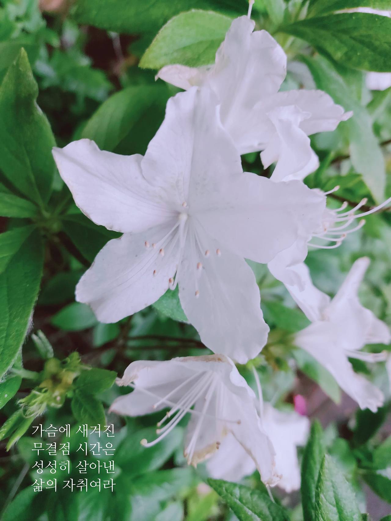 요가를 끝내고 집으로 돌아오는 길 모퉁이에 영산홍 꽃이 환하게 어둠을 밝히고 있다. 첫사랑의 꽃말처럼 낮보다 더 하얀빛을 띤 모습이 순일 그 자체다.