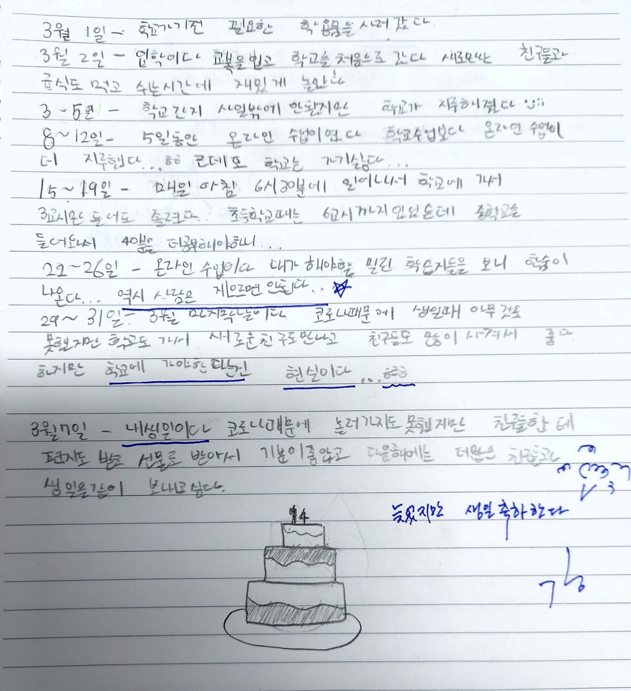“3월 2일은 내가 진짜 중학생이 된 느낌이 나는 하루다.... 학교 가는 길도 몰랐었고 학교 주변에 뭐가 있는지 하나도 몰랐지만 점점 학교에 가는 날이 많아지면서 알게 되었다. 학교 규칙들도 신기하고 이상했다. 초등학교랑 너무 달라서 신기해했던 3월이었고, 온라인도 계속 학교랑 똑같이 하니까 너무 힘들었다. ㅜ o ㅜ 그래도 좋았던 3월이다.”