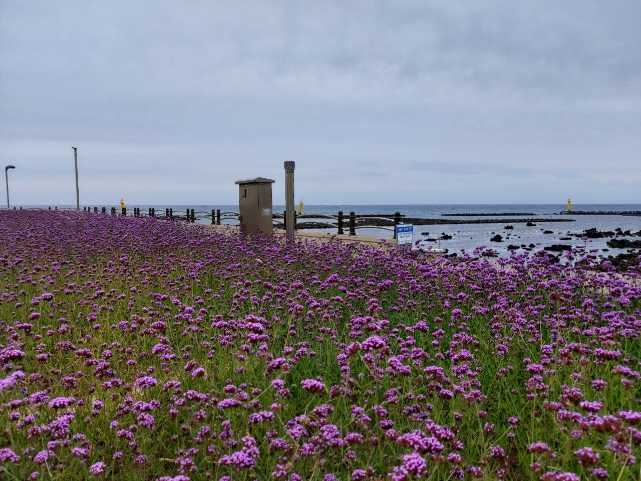 그렇게 늘어지게 잠을 자고는 저녁 준비를 위해 친정집을 나서는데 앞마당에 온갖 아기자기한 꽃들이 바람에 흔들거리고 있었다. 오늘따라 활짝 핀 꽃들이 어머니처럼 계속 수다를 떠는 것 같아 나도 모르게 웃음이 터져 나왔다. 그리고 다음 코스인 바다로 향했다. 오늘은 바다가 온통 회색빛이었다. 문득 지난번 이호 테우 해변이 생각나서 다시 가보았다. 꽃내음과 바다내음이 바람에 온통 뒤섞여 내 마음까지 흔들거렸다.