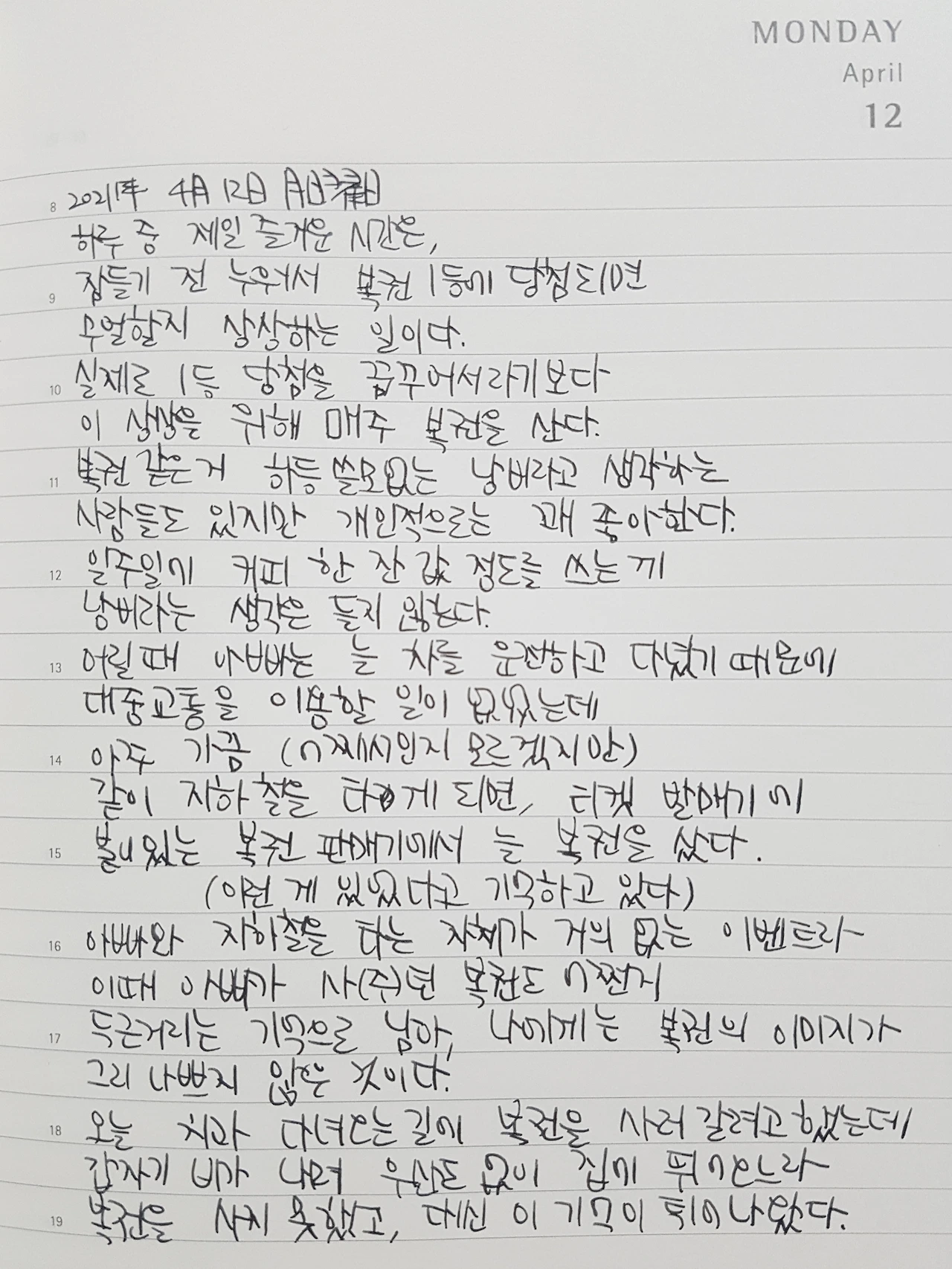 아빠와 지하철을 타는 자체가 거의 없는 이벤트라 이때 아빠가 사(주)던 복권도 어쩐지 두근거리는 기억으로 남아, 나에게는 복권의 이미지가 그리 나쁘지 않은 것이다.