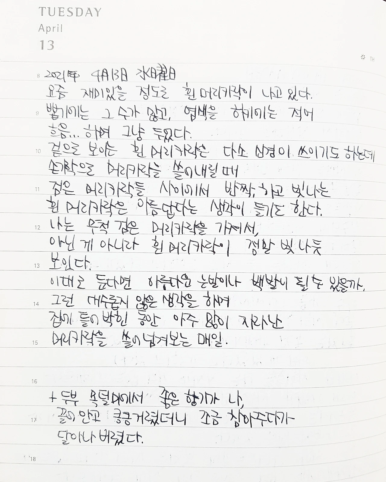 겉으로 보이는 흰 머리카락은 다소 신경이 쓰이기도 하는데, 손가락으로 머리카락을 쓸어내릴 때 검은 머리카락들 사이에서 반짝, 하고 빛나는 흰 머리카락은 아름답다는 생각이 들기도 한다.