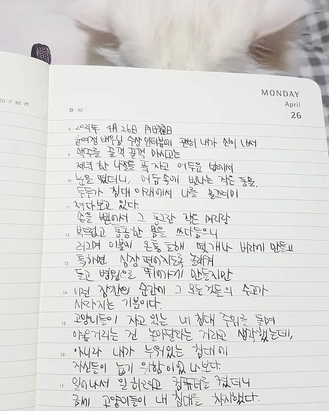 윤여정 배우님 수상 인터뷰에 괜히 내가 신이 나서 맥주를 꿀꺽꿀꺽 마시고는 저녁 한나절을 푹 자고 어두운 방에서 눈을 떴더니, 어둠 속에 빛나는 작은 동물.