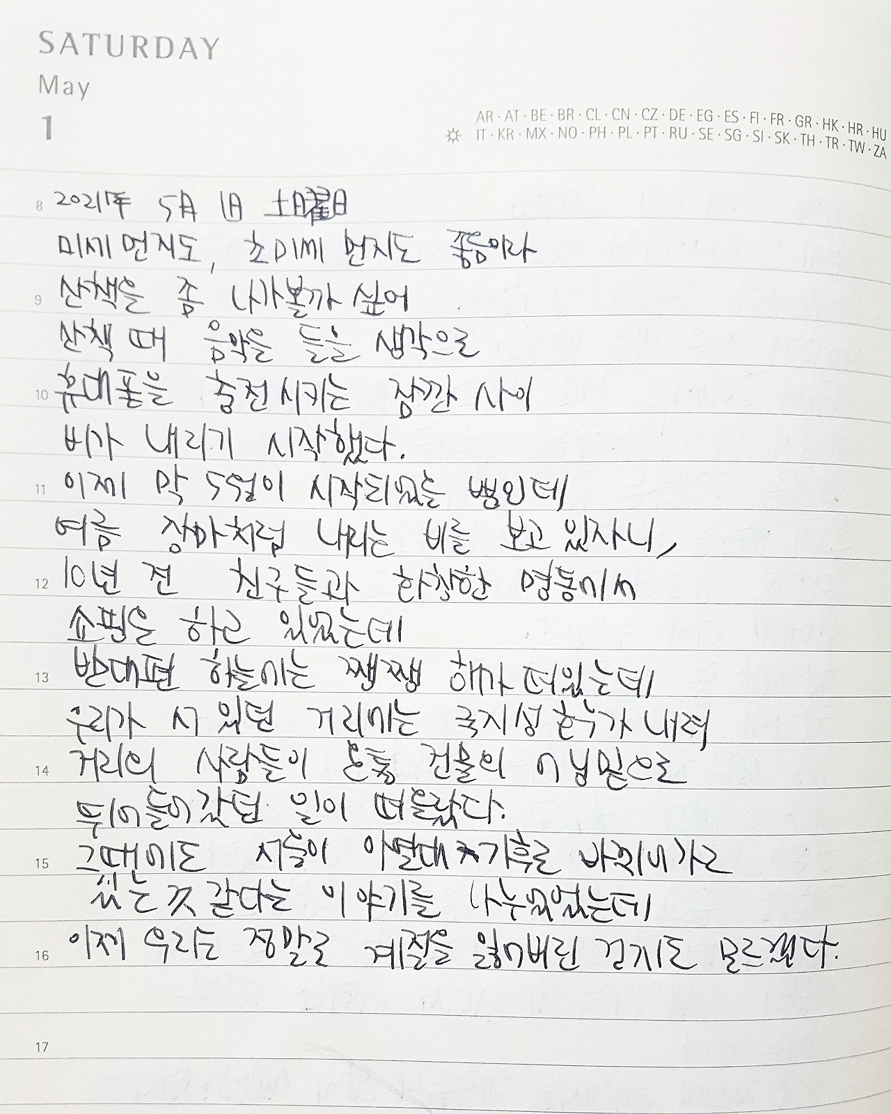 미세먼지도, 초미세먼지도 좋음이라 산책을 좀 나가볼까 싶어 산책 때 음악을 들을 생각으로 휴대폰을 충전시키는 잠깐 사이 비가 내리기 시작했다. 이제 막 5월이 시작되었을 뿐이데 여름 장마처럼 내리는 비를 보고 있자니, 10년 전 친구들과 화창한 명동에서 쇼핑을 하고 있었는데 반대편 하늘에는 쨍쨍 해가 떠 있는데 우리가 서 있던 거리에는 국지성 호우가 내려 거리의 사람들이 온통 건물의 어닝 밑으로 뛰어 들어갔던 일이 떠올랐다. 그때에도 서울이 아열대 기후로 바뀌어 가고 있는 것 같다는 이야기를 나누었었는데 이제 우리는 정말로 계절을 잃어버린 건지도 모르겠다.