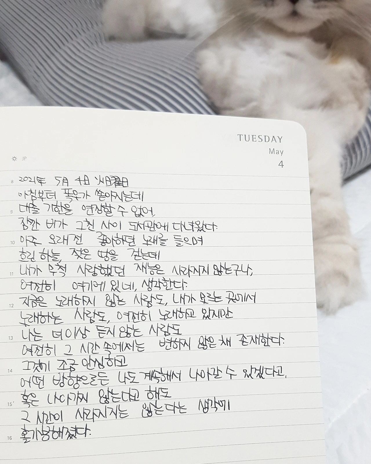 아침부터 폭우가 쏟아지는데 대출 기한을 연장할 수 없어, 잠깐 비가 그친 사이 도서관에 다녀왔다. 아주 오래전 좋아하던 노래를 들으며 흐린 하늘, 젖은 땅을 걷는데 내가 무척 사랑했던 재능은 사라지지 않는구나, 여전히 여기에 있네, 생각한다. 지금은 노래하지 않는 사람도, 내가 모르는 곳에서 노래하는 사람도, 여전히 노래하고 있지만 나는 더이상 듣지 않는 사람도 여전히 그 시간 속에서는 변하지 않은 채 존재한다. 그것에 조금 안심하고 어떤 방향으로든 나도 계속해서 나아갈 수 있겠다고. 혹은 나아가지 않는다고 해도 그 시간이 사라지지는 않는다는 생각에 홀가분해졌다.