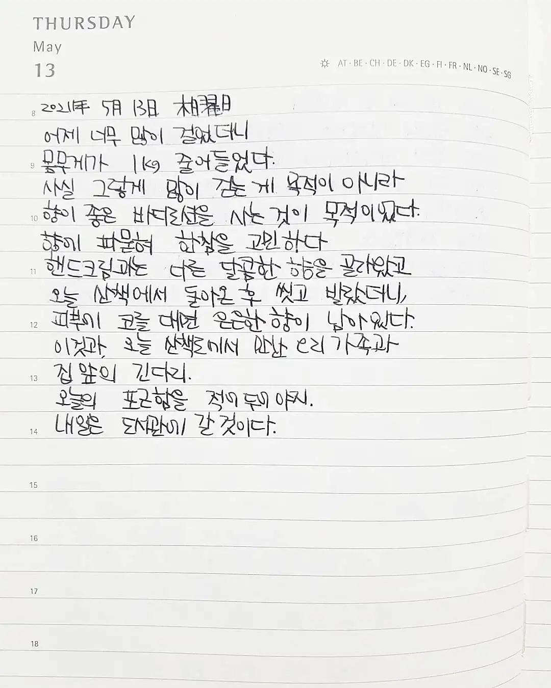 오늘 산책에서 돌아온 후 씻고 발랐더니, 피부에 코를 대면 은은한 향이 남아있다.