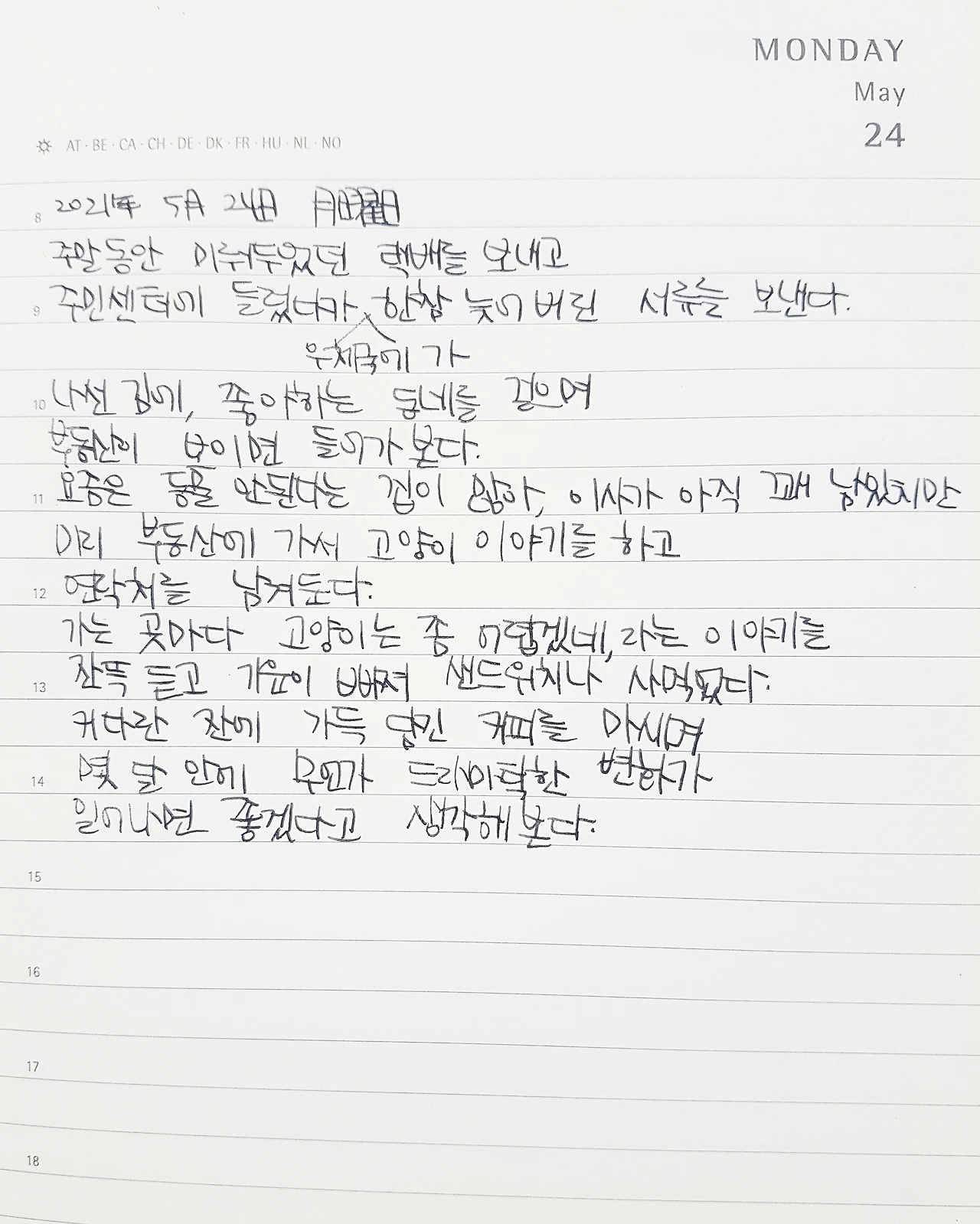 주말 동안 미뤄두었던 택배를 보내고 주민센터에 들렀다가 우체국에 가 한참 늦어버린 서류를 보낸다. 나선 김에, 좋아하는 동네를 걸으며 부동산이 보이면 들어가 본다. 요즘은 동물 안된다는 집이 많아, 이사가 아직 꽤 남았지만 미리 부동산에 가서 고양이 이야기를 하고 연락처를 남겨둔다. 가는 곳마다 고양이는 좀 어렵겠네, 라는 이야기를 잔뜩 듣고 기운이 빠져 샌드위치나 사 먹었다. 커다란 잔에 가득 담긴 커피를 마시며 몇 달 안에 무언가 드라마틱한 변화가 일어나면 좋겠다고 생각해본다.