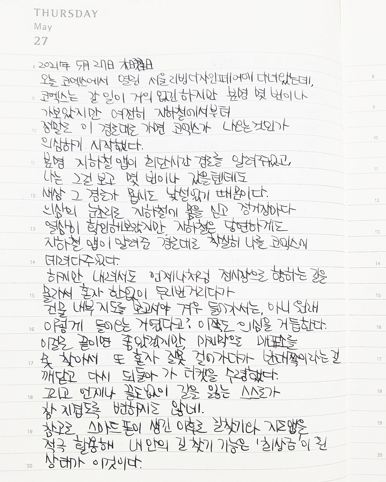 오늘 코엑스에서 열린 서울리빙디자인페어에 다녀왔는데, 코엑스는 갈 일이 거의 없긴 하지만, 분명 몇 번이나 가보았는데 여전히 지하철에서부터 정말로 이 경로대로 가면 코엑스가 나오는 것인가 의심하기 시작했다. 분명 지하철 앱이 최단 시간 경로를 알려주었고, 나는 그걸 보고 몇 번이나 갔을 텐데도 새삼 그 경로가 몹시도 낯설었기 때문이다. 의심의 눈초리로 지하철에 몸을 싣고 정거장마다 열심히 확인해보았지만, 지하철은 당연하게도 지하철 앱이 알려준 경로대로 착실히 나를 코엑스에 데려다주었다. 하지만 내려서도 언제나처럼 전시장으로 향하는 길을 몰라서 혼자 한없이 두리번거리다가 건물 내부 지도를 보고서야 겨우 들어가서는, 아니 원래 이렇게 들어오는 거였다고? 이쪽도 의심을 거듭한다. 이걸로 끝이면 좋았겠지만, 마지막으로 매표소를 못 찾아서 또 혼자 잘못 걸어가다가 반대쪽이라는 걸 깨닫고 다시 되돌아 가 티켓을 수령했다. 그리고 언제나 끝도 없이 길을 잃는 스스로가 참 지겹도록 변하지도 않네. 참고로, 스마트 폰이 생긴 이후로 길 찾기와 지도 앱을 적극 활용해 내 안의 길 찾기 기능은 '최상급'이 된 상태가 이것이다.