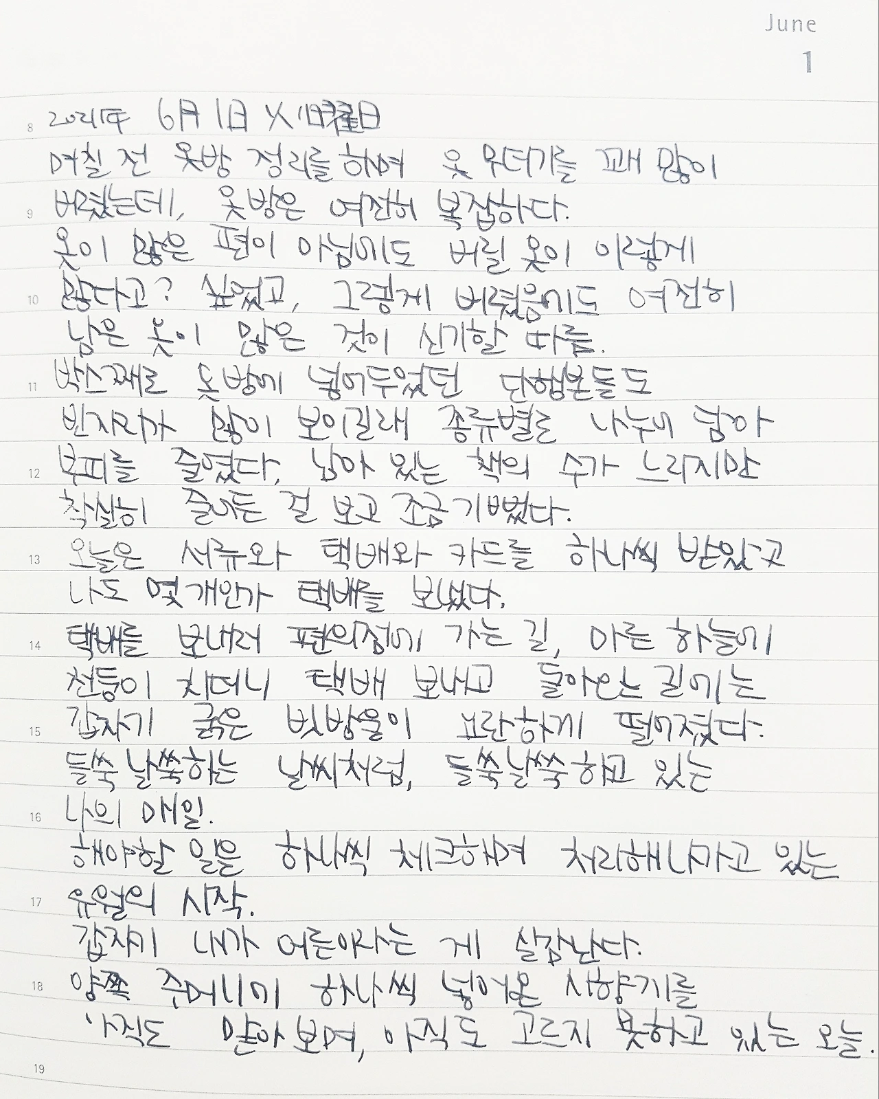 며칠 전 옷방 정리를 하며 옷 무더기를 꽤 많이 버렸는데, 옷방은 여전히 복잡하다. 옷이 많은 편이 아님에도 버릴 옷이 이렇게 많다고? 싶었고, 그렇게 버렸음에도 여전히 남은 옷이 많은 것이 신기할 따름. 박스 채로 옷방에 넣어두었던 단행본들도 빈자리가 많이 보이길래 종류별로 나누어 담아 부피를 줄였다. 남아있는 책의 수가 느리지만, 착실히 줄어든 걸 보고 조금 기뻤다. 오늘은 서류와 택배와 카드를 하나씩 받았고 나도 몇 개인가 택배를 보냈다. 택배를 보내러 편의점에 가는 길, 마른 하늘에 천둥이 치더니 택배 보내고 돌아오는 길에는 갑자기 굵은 빗방울이 요란하게 떨어졌다. 들쑥날쑥 하는 날씨처럼, 들쑥날쑥 하고 있는 나의 매일. 해야 할 일을 하나씩 체크하며 처리해나가고 있는 유월의 시작. 갑자기 내가 어른이라는 게 실감난다. 양쪽 주머니에 하나씩 넣어 온 시향지를 아직도 맡아보며, 아직도 고르지 못하고 있는 오늘.