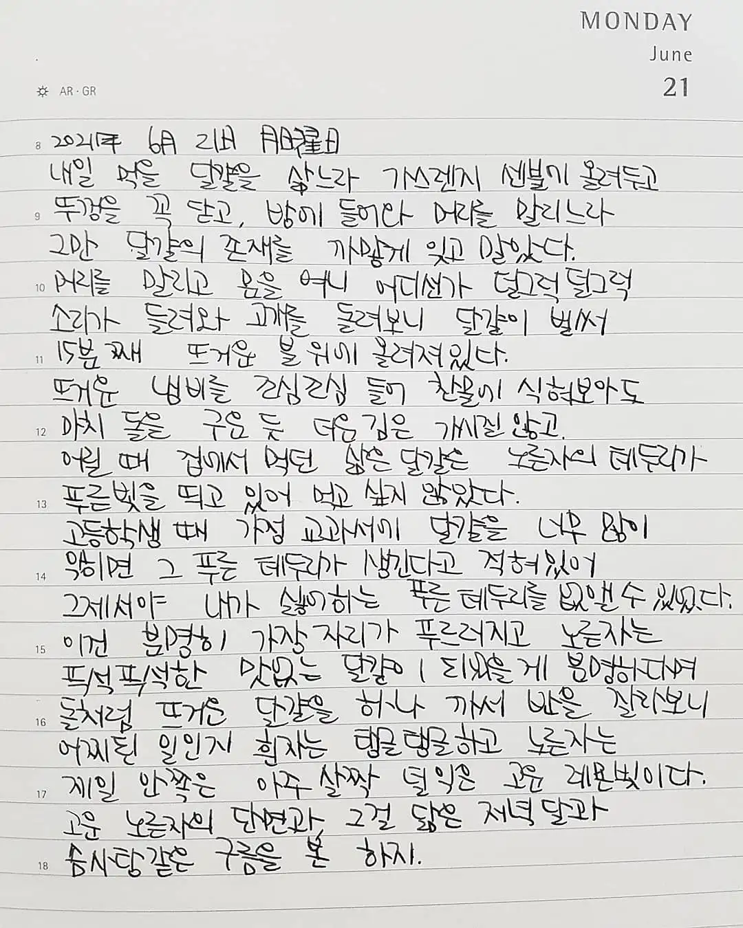 고운 노른자의 단면과, 그걸 닮은 저녁달과 솜사탕 같은 구름을 본 하지.