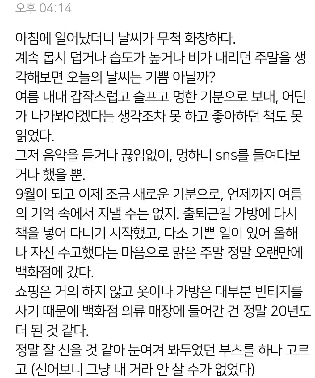 9월이 되고 이제 조금 새로운 기분으로, 언제까지 여름의 기억 속에서 지낼 수는 없지. 출퇴근길 가방에 다시 책을 넣어 다니기 시작했고, 다소 기쁜 일이 있어 올해 나 자신 수고했다는 마음으로 맑은 주말 정말 오랜만에 백화점에 갔다.