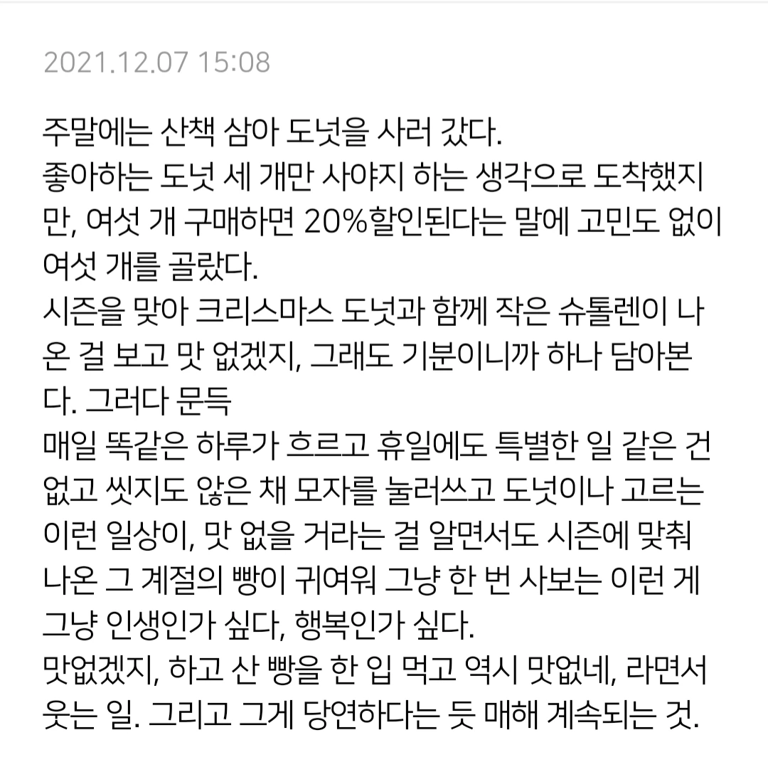 매일 똑같은 하루가 흐르고 휴일에도 특별한 일 같은 건 없고 씻지도 않은 채 모자를 눌러쓰고 도넛이나 고르는 이런 일상이, 맛 없을 거라는 걸 알면서도 시즌에 맞춰 나온 그 계절의 빵이 귀여워 그냥 한 번 사보는 이런 게 그냥 인생인가 싶다, 행복인가 싶다.