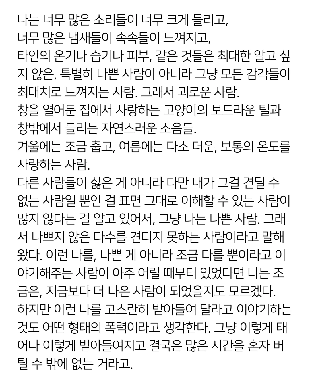 타인의 온기나 습기나 피부, 같은 것들은 최대한 알고 싶지 않은, 특별히 나쁜 사람이 아니라 그냥 모든 감각들이 최대치로 느껴지는 사람. 그래서 괴로운 사람.