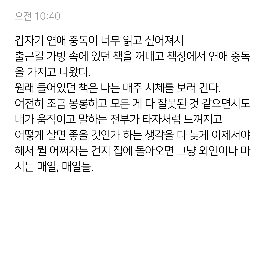여전히 조금 몽롱하고 모든 게 다 잘못된 것 같으면서도 내가 움직이고 말하는 전부가 타자처럼 느껴지고 어떻게 살면 좋을 것인가 하는 생각을 다 늦게 이제서야 해서 뭘 어쩌자는 건지 집에 돌아오면 그냥 와인이나 마시는 매일, 매일들.