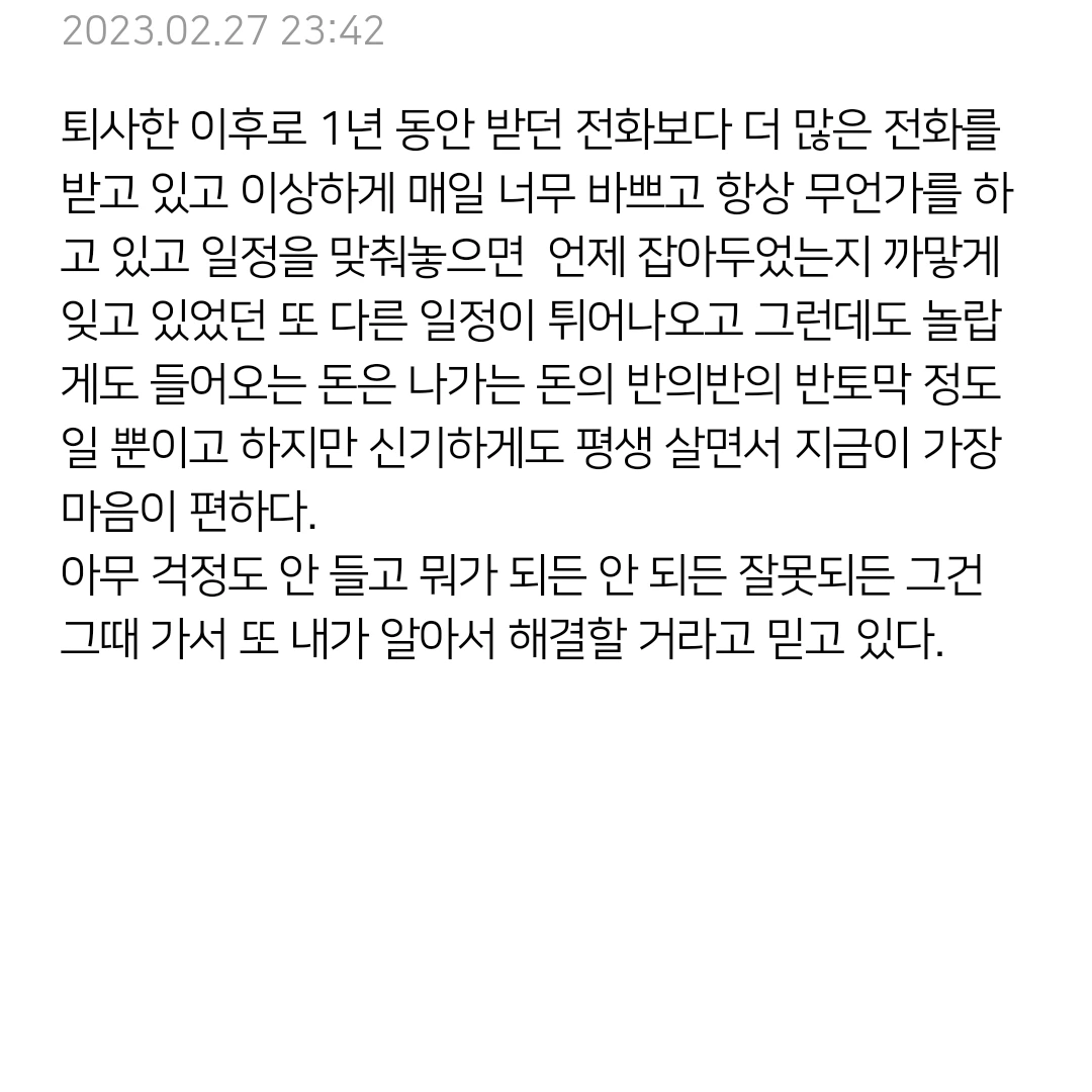 퇴사한 이후로 1년 동안 받던 전화보다 더 많은 전화를 받고 있고 이상하게 매일 너무 바쁘고 항상 무언가를 하고 있고 일정을 맞춰놓으면 언제 잡아두었는지 까맣게 잊고 있었던 또 다른 일정이 튀어나오고 그런데도 놀랍게도 들어오는 돈은 나가는 돈의 반의반의 반토막 정도일 뿐이고 하지만 신기하게도 평생 살면서 지금이 가장 마음이 편하다.