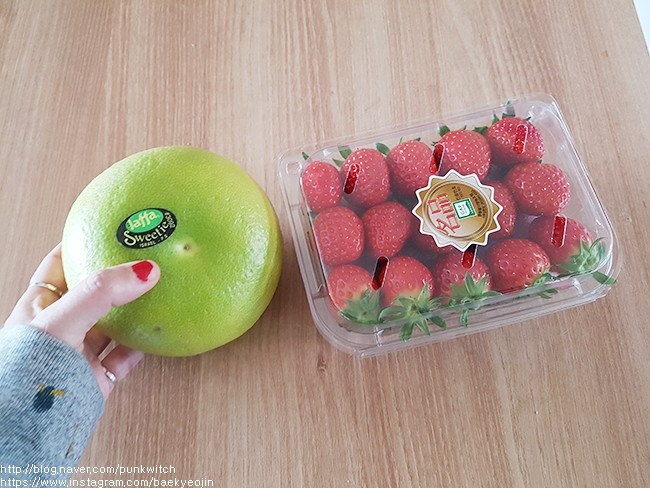 돌아오는 길 동네 과일 가게에서 딸기를 한 팩 사고, 너무 커서 놀라운 청 자몽을 하나 샀다.