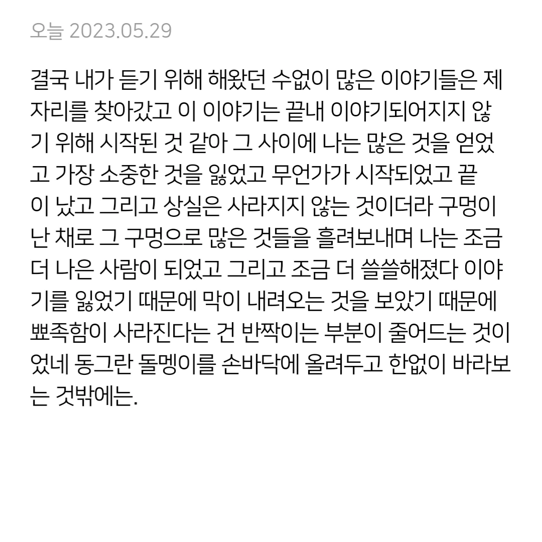 결국 내가 듣기 위해 해왔던 수없이 많은 이야기들은 제자리를 찾아갔고 이 이야기는 끝내 이야기되어지지 않기 위해 시작된 것 같아 그 사이에 나는 많은 것을 얻었고 가장 소중한 것을 잃었고 무언가가 시작되었고 끝이 났고 그리고 상실은 사라지지 않는 것이더라 구멍이 난 채로 그 구멍으로 많은 것들을 흘려보내며 나는 조금 더 나은 사람이 되었고 그리고 조금 더 쓸쓸해졌다 이야기를 잃었기 때문에 막이 내려오는 것을 보았기 때문에 뾰족함이 사라진다는 건 반짝이는 부분이 줄어드는 것이었네 동그란 돌멩이를 손바닥에 올려두고 한없이 바라보는 것밖에는.