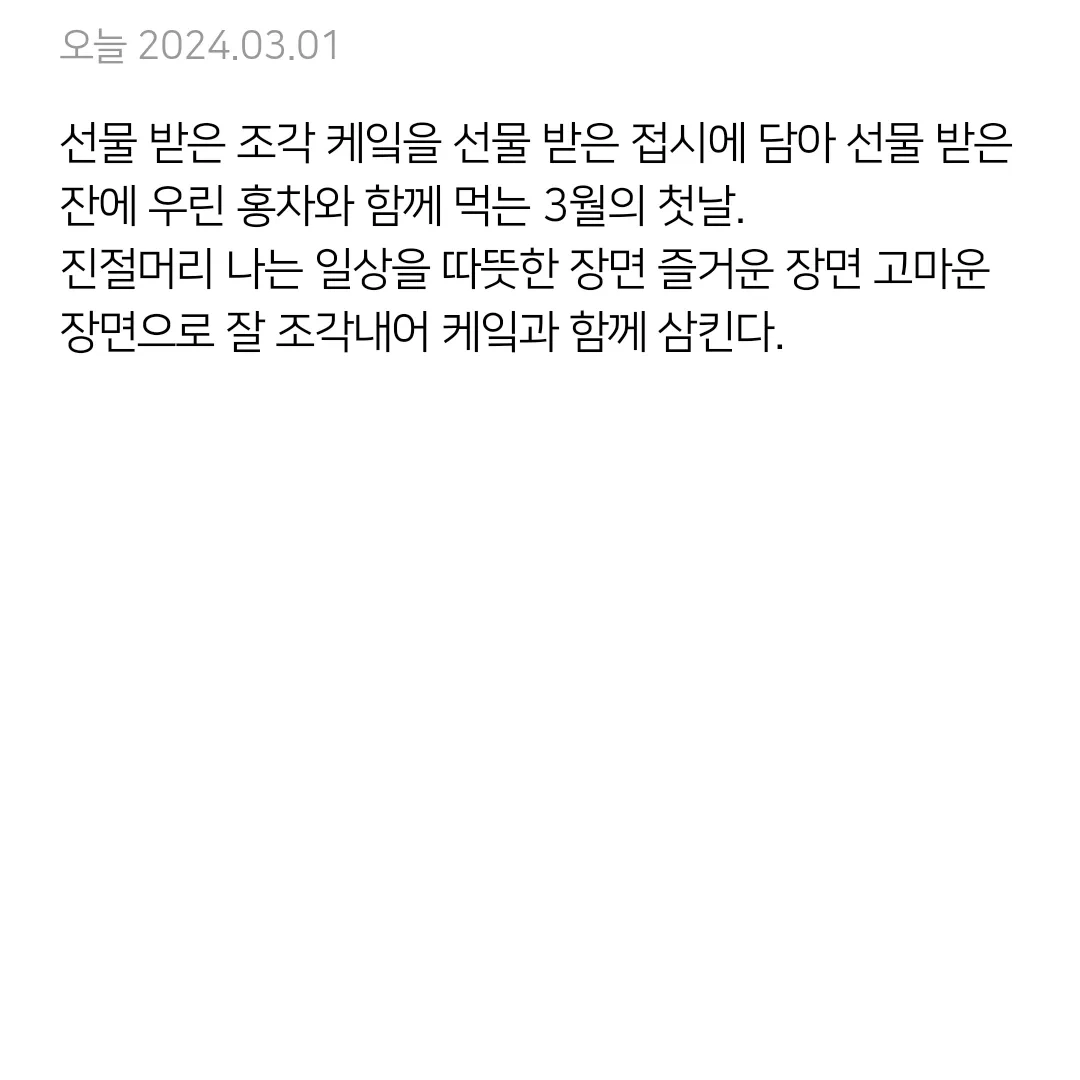 선물 받은 조각 케잌을 선물 받은 접시에 담아 선물 받은 잔에 우린 홍차와 함께 먹는 3월의 첫날.