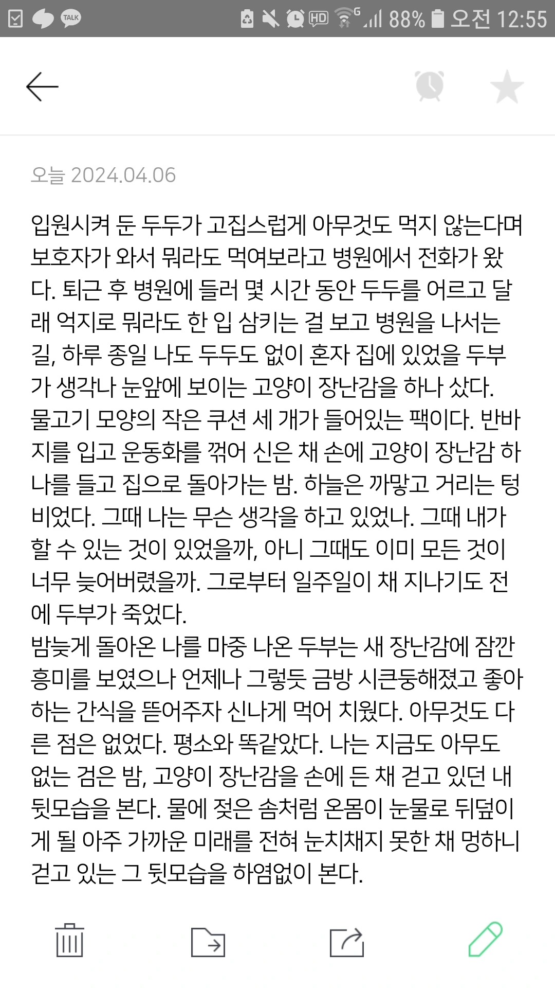 반바지를 입고 운동화를 꺾어 신은 채 손에 고양이 장난감 하나를 들고 집으로 돌아가는 밤. 하늘은 까맣고 거리는 텅 비었다. 그때 나는 무슨 생각을 하고 있었나. 그때 내가 할 수 있는 것이 있었을까, 아니 그때도 이미 모든 것이 너무 늦어버렸을까. 그로부터 일주일이 채 지나기도 전에 두부가 죽었다.