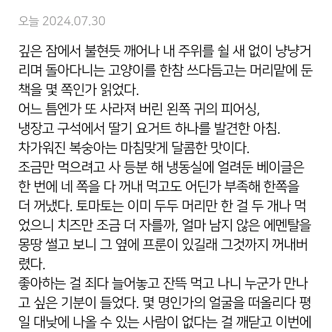 조금만 먹으려고 사 등분 해 냉동실에 얼려둔 베이글은 한 번에 네 쪽을 다 꺼내 먹고도 어딘가 부족해 한쪽을 더 꺼냈다. 토마토는 이미 두두 머리만 한 걸 두 개나 먹었으니 치즈만 조금 더 자를까, 얼마 남지 않은 에멘탈을 몽땅 썰고 보니 그 옆에 프룬이 있길래 그것까지 꺼내버렸다.