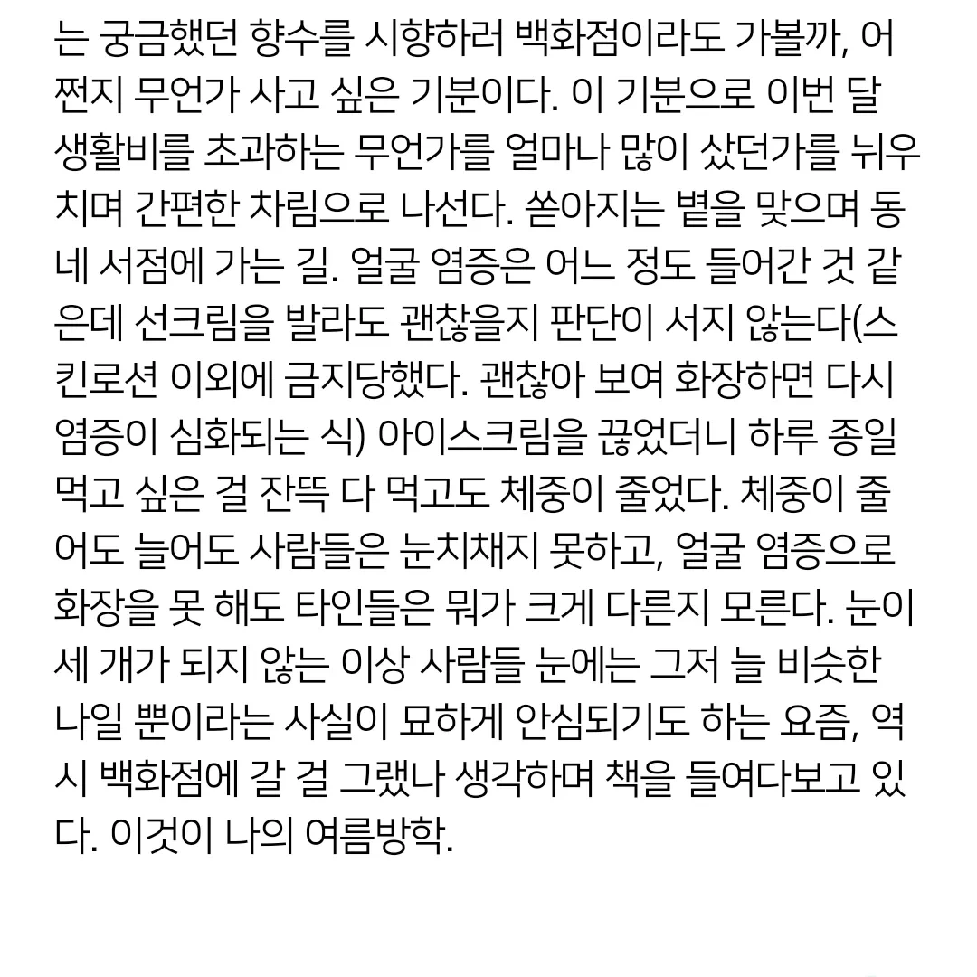 좋아하는 걸 죄다 늘어놓고 잔뜩 먹고 나니 누군가 만나고 싶은 기분이 들었다. 몇 명인가의 얼굴을 떠올리다 평일 대낮에 나올 수 있는 사람이 없다는 걸 깨닫고 이번에는 궁금했던 향수를 시향하러 백화점이라도 가볼까, 어쩐지 무언가 사고 싶은 기분이다. 이 기분으로 이번 달 생활비를 초과하는 무언가를 얼마나 많이 샀던가를 뉘우치며 간편한 차림으로 나선다. 쏟아지는 볕을 맞으며 동네 서점에 가는 길. 얼굴 염증은 어느 정도 들어간 것 같은데 선크림을 발라도 괜찮을지 판단이 서지 않는다(스킨로션 이외에 금지당했다. 괜찮아 보여 화장하면 다시 염증이 심화되는 식) 아이스크림을 끊었더니 하루 종일 먹고 싶은 걸 잔뜩 다 먹고도 체중이 줄었다. 체중이 줄어도 늘어도 사람들은 눈치채지 못하고, 얼굴 염증으로 화장을 못 해도 타인들은 뭐가 크게 다른지 모른다. 눈이 세 개가 되지 않는 이상 사람들 눈에는 그저 늘 비슷한 나일 뿐이라는 사실이 묘하게 안심되기도 하는 요즘, 역시 백화점에 갈 걸 그랬나 생각하며 책을 들여다보고 있다. 이것이 나의 여름방학.