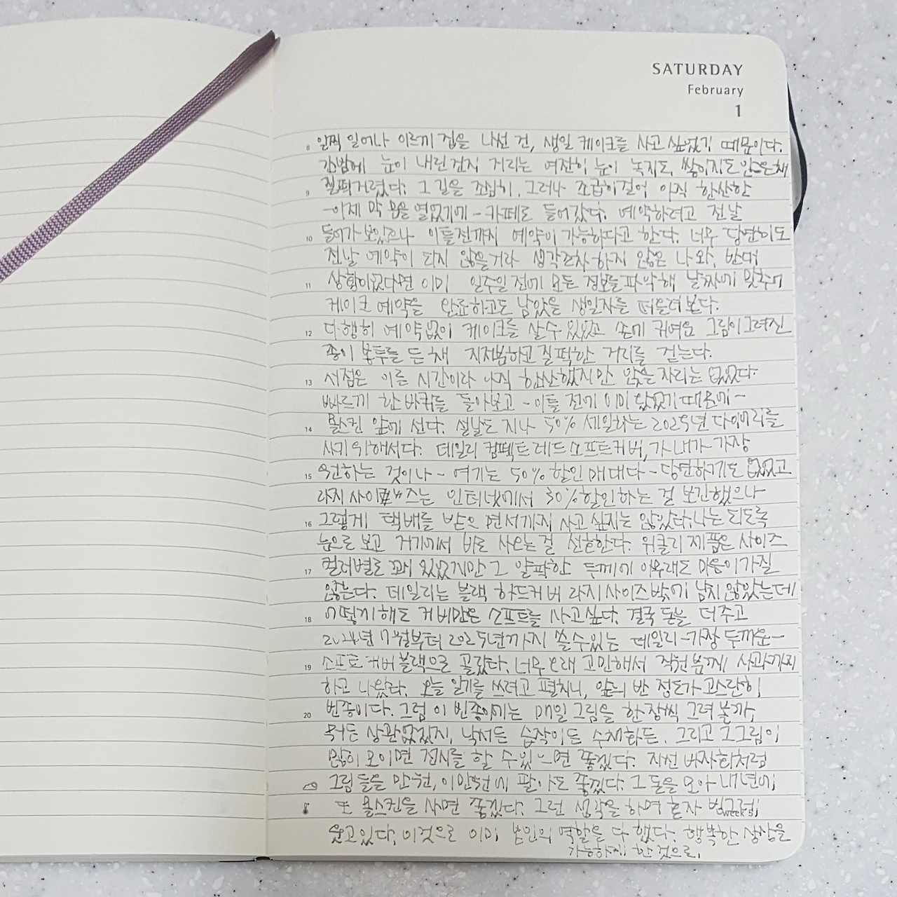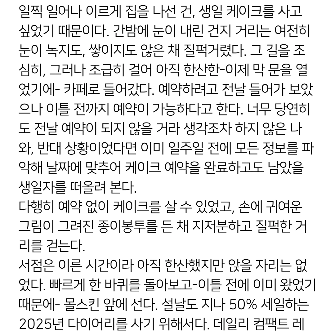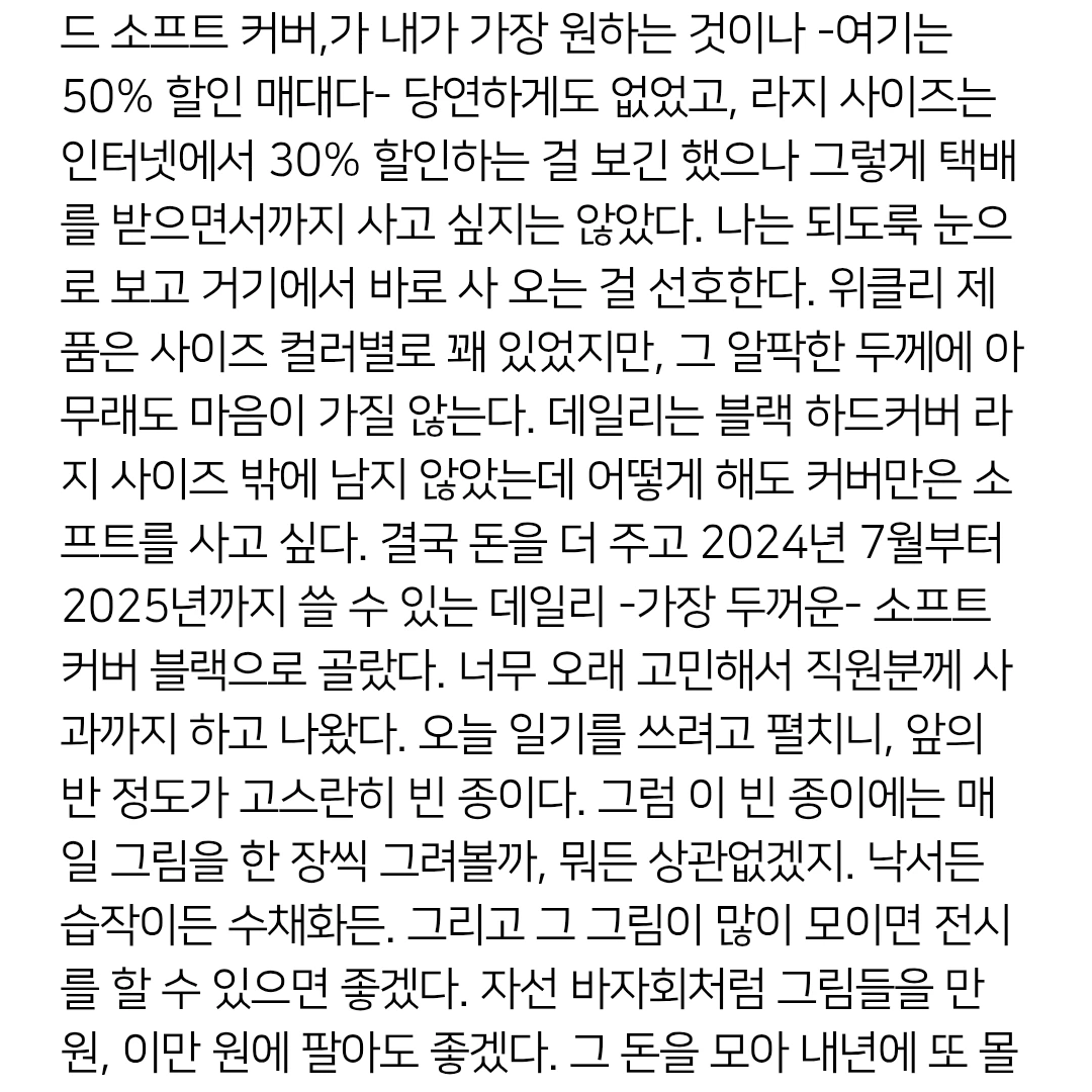 서점은 이른 시간이라 아직 한산했지만 앉을 자리는 없었다. 빠르게 한 바퀴를 돌아보고-이틀 전에 이미 왔었기 때문에- 몰스킨 앞에 선다. 설날도 지나 50% 세일하는 2025년 다이어리를 사기 위해서다. 데일리 컴팩트 레드 소프트 커버,가 내가 가장 원하는 것이나 -여기는 50% 할인 매대다- 당연하게도 없었고, 라지 사이즈는 인터넷에서 30% 할인하는 걸 보긴 했으나 그렇게 택배를 받으면서까지 사고 싶지는 않았다. 나는 되도룩 눈으로 보고 거기에서 바로 사 오는 걸 선호한다. 위클리 제품은 사이즈 컬러별로 꽤 있었지만, 그 알팍한 두께에 아무래도 마음이 가질 않는다. 데일리는 블랙 하드커버 라지 사이즈 밖에 남지 않았는데 어떻게 해도 커버만은 소프트를 사고 싶다. 결국 돈을 더 주고 2024년 7월부터 2025년까지 쓸 수 있는 데일리 -가장 두꺼운- 소프트 커버 블랙으로 골랐다. 너무 오래 고민해서 직원분께 사과까지 하고 나왔다. 오늘 일기를 쓰려고 펼치니, 앞의 반 정도가 고스란히 빈 종이다. 그럼 이 빈 종이에는 매일 그림을 한 장씩 그려볼까, 뭐든 상관없겠지. 낙서든 습작이든 수채화든. 그리고 그 그림이 많이 모이면 전시를 할 수 있으면 좋겠다. 자선 바자회처럼 그림들을 만 원, 이만 원에 팔아도 좋겠다. 그 돈을 모아 내년에 또 몰스킨을 사면 좋겠다. 그런 생각을 하며 혼자 빙그레 웃고 있다. 이것으로 이미 본인의 역할을 다했다. 행복한 상상을 가능하게 한 것으로.