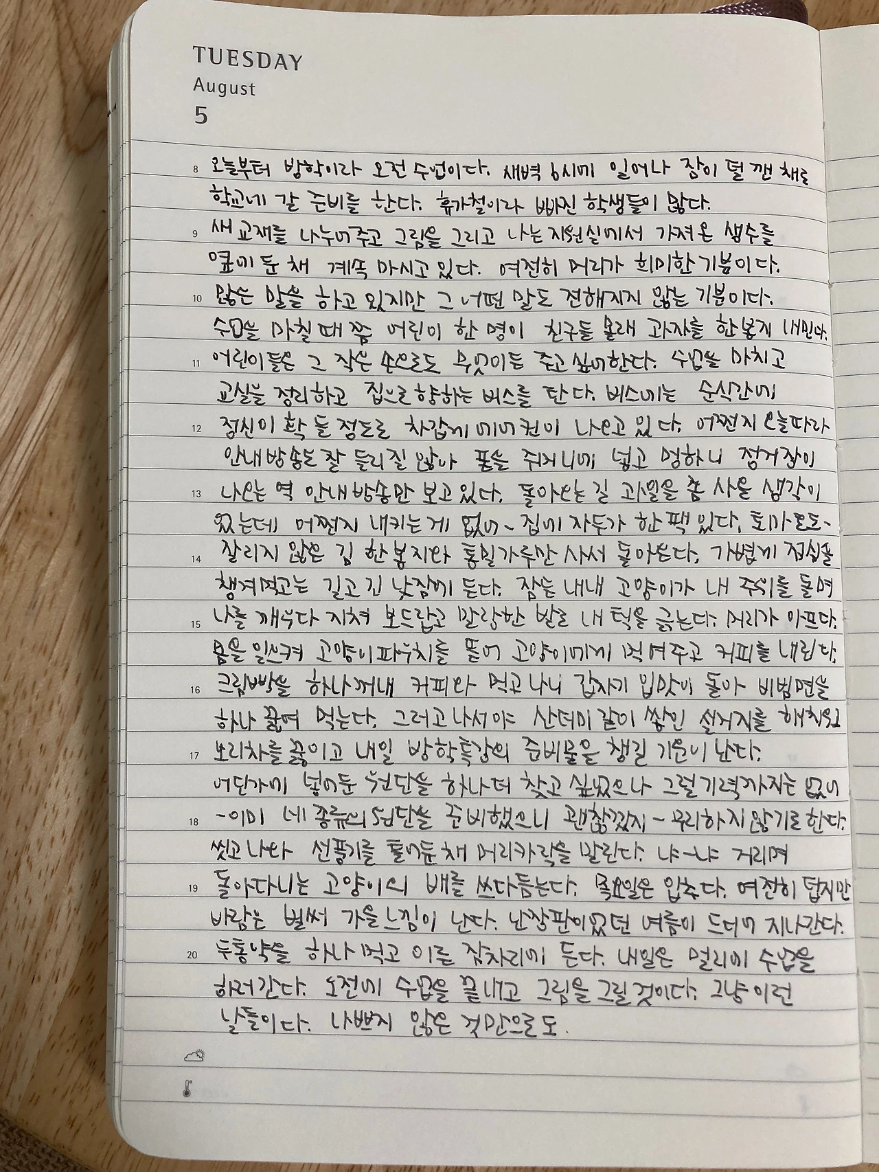 어린이들은 그 작은 손으로도 무엇이든 주고 싶어 한다. 수업을 마치고 교실을 정리하고 집으로 향하는 버스를 탄다. 버스에는 순식간에 정신이 확 들 정도로 차갑게 에어컨이 나오고 있다. 어쩐지 오늘따라 안내 방송이 잘 들리질 않아. 폰을 주머니에 넣고 멍하니 정거장이 나오는 역 안내 방송만 보고 있다. 돌아오는 길 과일을 좀 살 생각이었는데 어쩐지 내키는 게 없어 -집에 자두가 한 팩 있다. 토마토도- 잘리지 않은 김 한 봉지와 통밀가루만 사서 돌아온다. 가볍게 점심을 챙겨 먹고는 길고 긴 낮잠에 든다. 잠든 내내 고양이가 내 주위를 돌며 나를 깨우다 지쳐 보드랍고 말랑한 발로 내 턱을 긁는다. 머리가 아프다. 몸을 일으켜 고양이 파우치를 뜯어 고양이에게 먹여주고 커피를 내린다. 크림빵을 하나 꺼내 커피와 먹고 나니 갑자기 입맛이 돌아 비빔면을 하나 끓여 먹는다. 그러고 나서야 산더미같이 쌓인 설거지를 해치우고 보리차를 끓이고 내일 방학 특강의 준비물을 챙길 기운이 난다.