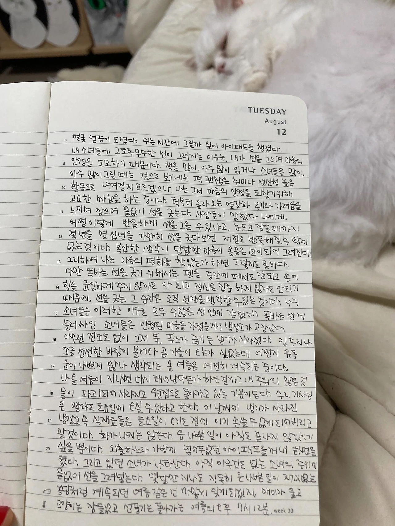 얼굴 염증이 도졌다. 쉬는 시간에 그릴까 싶어 아이패드를 챙겼다. 내 소녀들에 그토록 무수한 선이 그려지는 이유는, 내가 선을 그으며 마음의 안정을 도모하기 때문이다. 책을 많이, 아주 많이 읽거나 소녀들을 많이, 아주 많이 그릴 때는 겉으로 보기에는 퍽 괜찮은 취미나 생산성 높은 활동으로 느껴질지 모르겠으나. 나는 그저 마음의 안정을 되찾기 위해 고요한 싸움을 하는 중이다. 턱부터 올라오는 열감과 부기와 가려움을 느끼며 참으며 끝없이 선을 긋는다. 사람들이 말했다 나에게. 어쩜 이렇게 반듯하게 선을 그을 수 있냐고. 눈뜨고 잠들 때까지 몇 년을 몇십 년을 가만히 선을 긋다 보면 저절로 반듯해질 수밖에 없는 것이다. 복잡한 생각이 답답한 마음이 올곧은 선이 되어 그려진다. 그리하여 나는 마음의 평화를 찾았는가 하면 그렇지도 못하다. 다만 똑바른 선을 긋기 위해서는 펜을 중간에 떼서도 안 되고 손에 힘을 균일하게 주지 않아도 안 되고 정신을 집중하지 않아도 안 되기 때문에, 선을 긋는 그 순간은 오직 선만을 생각할 수 있는 것이다. 나의 소녀들은 이러한 이유로 모두 수많은 선 안에 갇혔다. 똑바른 선에 둘러싸인 소녀들은 안정된 마음을 가졌을까? 냉장고가 고장났다. 아무런 전조도 없이 그저 뚝, 퓨즈가 끊기듯 냉기가 사라졌다. 입추 지나 조금 선선한 바람이 불어와 곧 가을이 오는가 싶었는데, 어쩐지 유독 운이 나쁘지 않나 생각되는 올여름은 여전히 계속되는 중이다. 나 올 여름이 지나면 다시 태어난다든가 하는 걸까? 내 주위의 많은 것들이 파괴되어 사라지고 원점으로 돌아가고 있는 기분이 든다. 수리 기사님은 빨라도 토요일에 오실 수 있다고 한다. 이 날씨에 냉기가 사라진 냉장고 속 식재료들은 토요일이 오기도 전에 이미 손 쓸 수 없게 되어버리고 말 것이다. 화가 나지는 않는다. 운 나쁜 일이 아직도 끝나지 않았네 싶을 뿐이다. 외출하느라 가방에 넣어두었던 아이패드를 꺼내 화면을 켰다. 그리고 있던 소녀가 나타난다. 아직 아무것도 없는 소녀의 주위에 끝없이 선을 그려 넣는다. 몇 달만 지나도 지독히 운 나쁜 일이 재미없는 농담처럼 계속되던 여름 같은 건 까맣게 잊게 되겠지. 매미가 울고 고양이는 잠들었고, 선풍기는 돌아가는 여름의 오후 7시 12분.