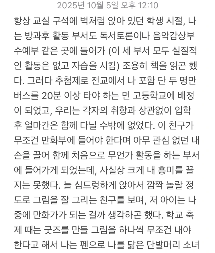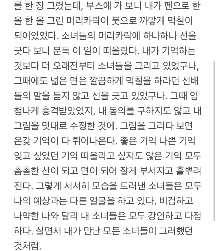 항상 교실 구석에 벽처럼 앉아 있던 학생 시절, 나는 방과후 활동 부서도 독서토론이나 음악감상부 수예부 같은 곳에 들어가 (이 세 부서 모두 실질적인 활동은 없고 자습을 시킴) 조용히 책을 읽곤 했다. 그러다 추첨제로 전교에서 나 포함 단 두 명만 버스를 20분 이상 타야 하는 먼 고등학교에 배정이 되었고, 우리는 각자의 취향과 상관없이 입학 후 얼마간은 함께 다닐 수밖에 없었다. 이 친구가 무조건 만화부에 들어야 한다며 아무 관심 없던 내 손을 끌어 함께 처음으로 무언가 활동을 하는 부서에 들어가게 되었는데, 사실상 크게 내 흥미를 끌지는 못했다. 늘 심드렁하게 앉아서 깜짝 놀랄 정도로 그림을 잘 그리는 친구를 보며, 저 아이는 나중에 만화가가 되는 걸까 생각하곤 했다. 학교 축제 때는 굿즈를 만들 그림을 하나씩 무조건 내야 한다고 해서 나는 펜으로 나를 닮은 단발머리 소녀를 한 장 그렸는데, 부스에 가 보니 내가 펜으로 한 올 한 올 그린 머리카락이 붓으로 까맣게 먹칠이 되어있었다. 소녀들의 머리카락에 하나하나 선을 긋다 보니 문득 이 일이 떠올랐다. 내가 기억하는 것보다 더 오래전부터 소녀들을 그리고 있었구나, 그때에도 넓은 면은 깔끔하게 먹칠을 하라던 선배들의 말을 듣지 않고 선을 긋고 있었구나. 그때 엄청나게 충격받았었지, 내 동의를 구하지도 않고 내 그림을 멋대로 수정한 것에. 그림을 그리다 보면 온갖 기억이 다 튀어나온다. 좋은 기억 나쁜 기억 잊고 싶었던 기억 떠올리고 싶지도 않은 기억 모두 촘촘한 선이 되고 면이 되어 잘게 부서지고 흩뿌려진다. 그렇게 서서히 모습을 드러낸 소녀들은 모두 나의 예상과는 다른 얼굴을 하고 있다. 비겁하고 나약한 나와 달리 내 소녀들은 모두 강인하고 다정하다. 살면서 내가 만난 모든 소녀들이 그러했던 것처럼.