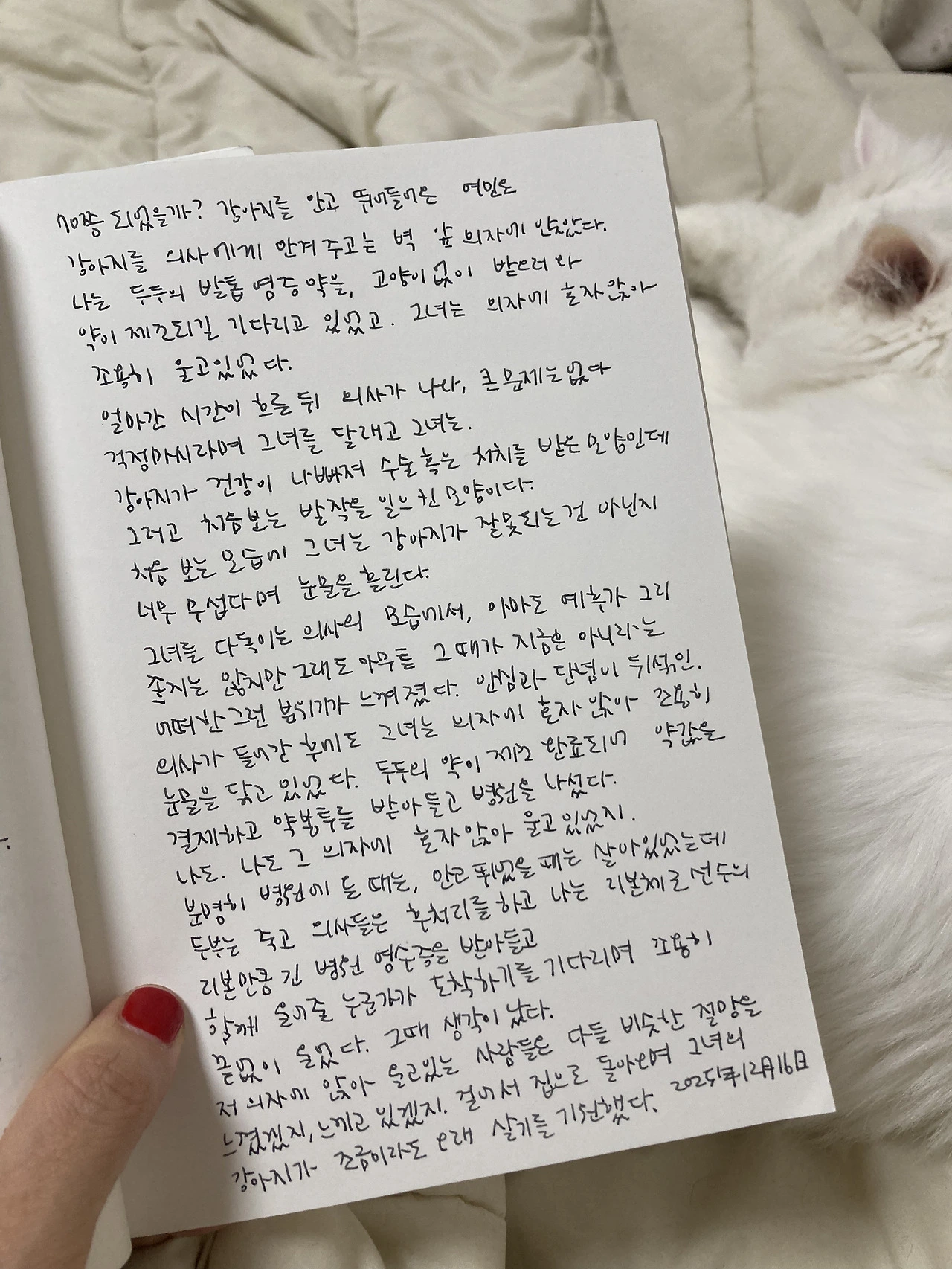 저 의자에 앉아 울고 있는 사람들은 다들 비슷한 절망을 느꼈겠지, 느끼고 있겠지. 걸어서 집으로 돌아오며 그녀의 강아지가 조금이라도 오래 살기를 기원했다.