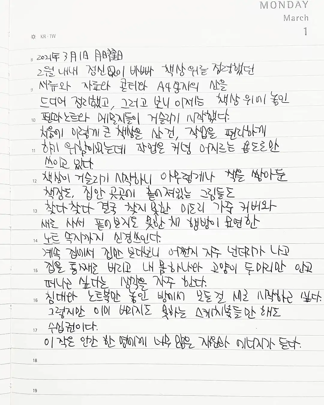 2월 내내 정신없이 바빠 책상 위를 점령했던 서류와 자료와 콘티와 A4용지의 산을 드디어 정리했고, 그러고 보니 이제는 책상 위에 놓인 펜과 노트와 메모지들이 거슬리기 시작했다.