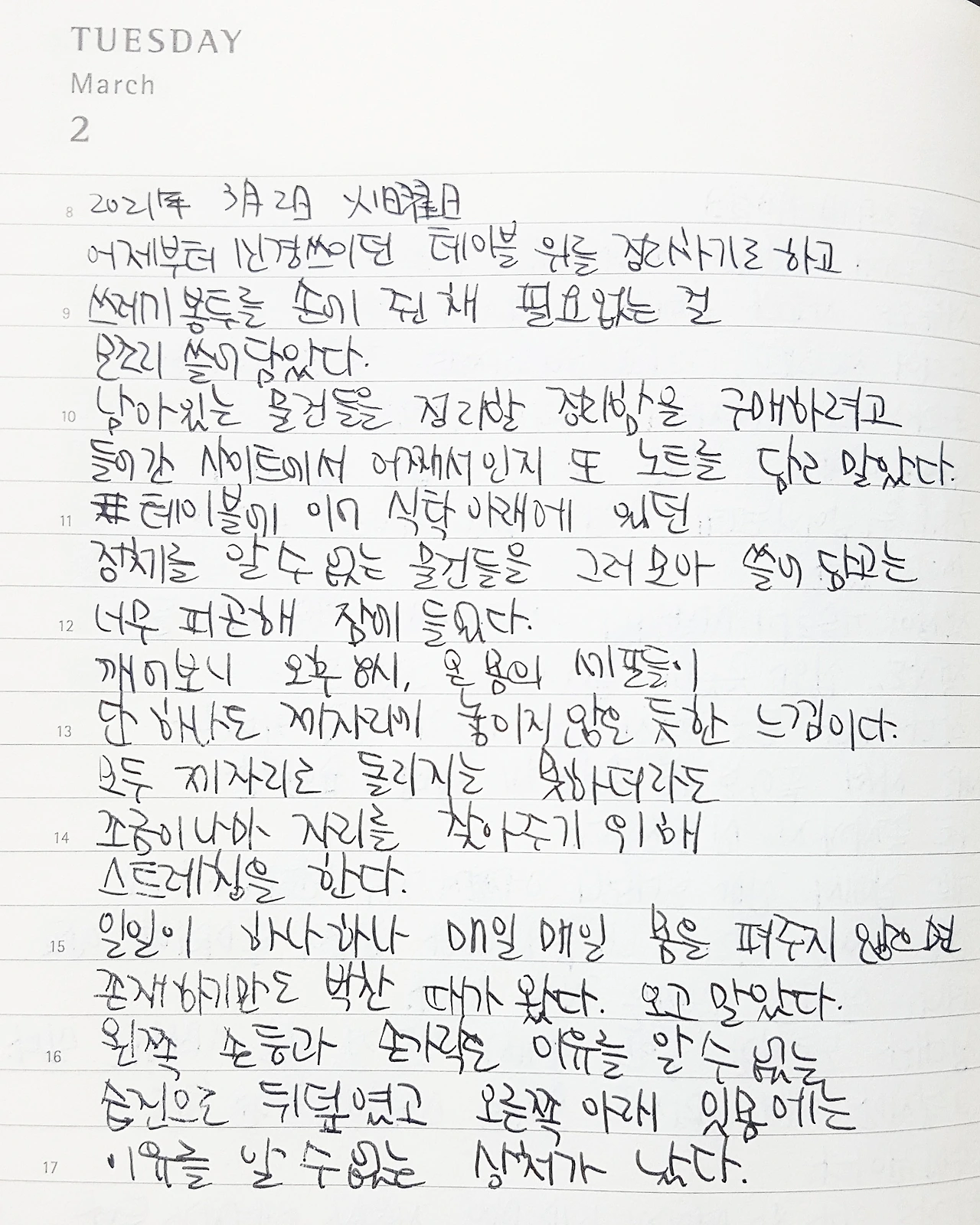 테이블에 이어 식탁 아래에 있던 정체를 알 수 없는 물건들을 그러모아 쓸어 담고는 너무 피곤해 잠에 들었다.