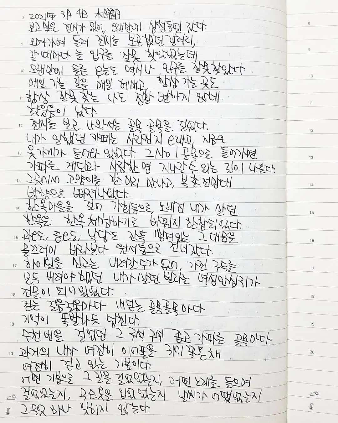 어떤 기분으로 그 길을 걸었었는지, 어떤 노래를 들으며 걸었었는지, 무슨 옷을 입었었는지 날씨가 어땠었는지 그 무엇 하나 잊히지 않는다.