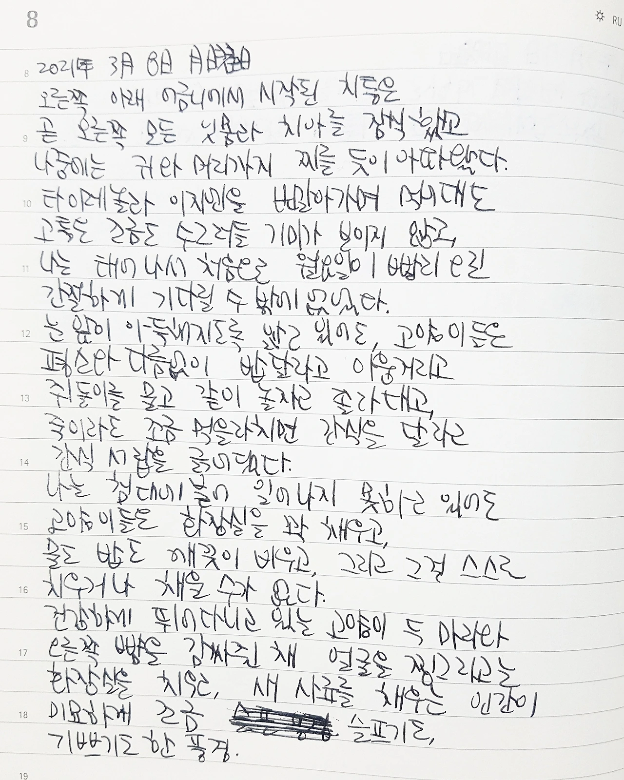 건강하게 뛰어다니고 있는 고양이 두 마리와 오른쪽 뺨을 감싸 쥔 채 얼굴을 찡그리고는 화장실을 치우고, 새 사료를 채우는 인간이 미묘하게 조금 슬프기도, 기쁘기도 한 풍경.