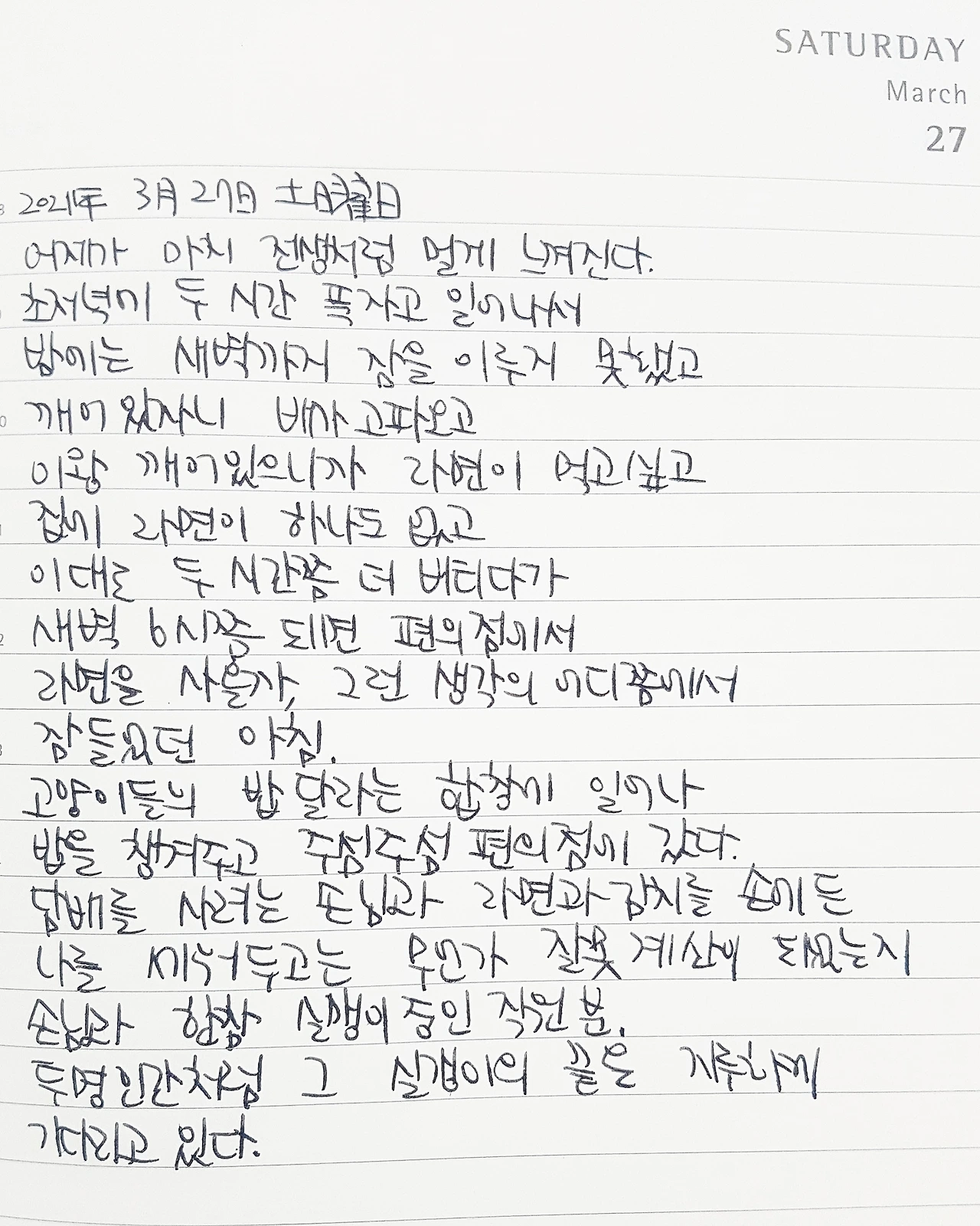 이대로 두 시간쯤 버티다가 새벽 6시쯤 되면 편의점에서 라면을 사 올까, 그런 생각의 어디쯤에서 잠들었던 아침.