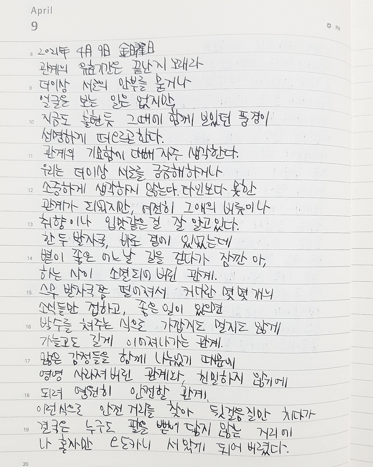 스무 발자국쯤 떨어져서 커다란 몇몇 개의 소식들만 접하고, 좋은 일이 있으면 박수를 쳐주는 식으로 가깝지도 멀지도 않게 가늘고도 길게 이어져나가는 관계.