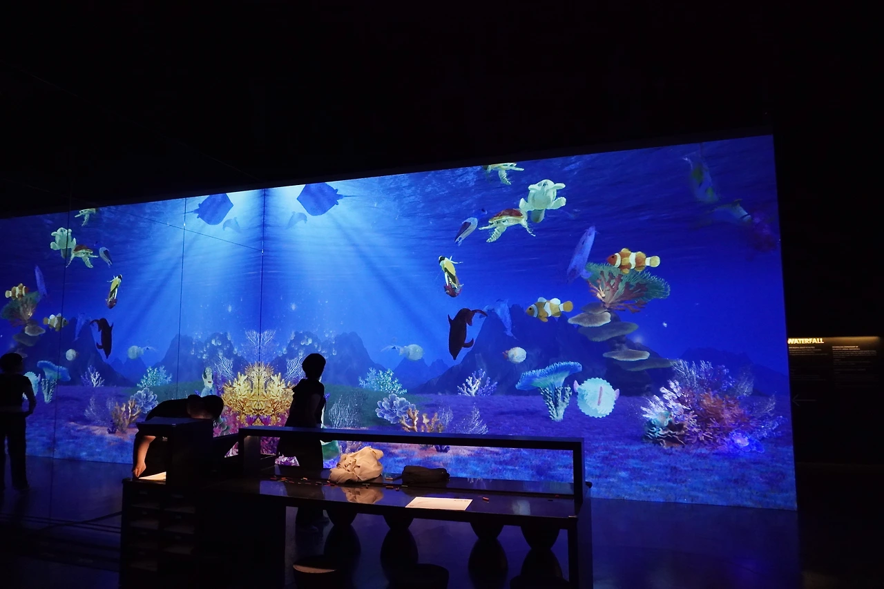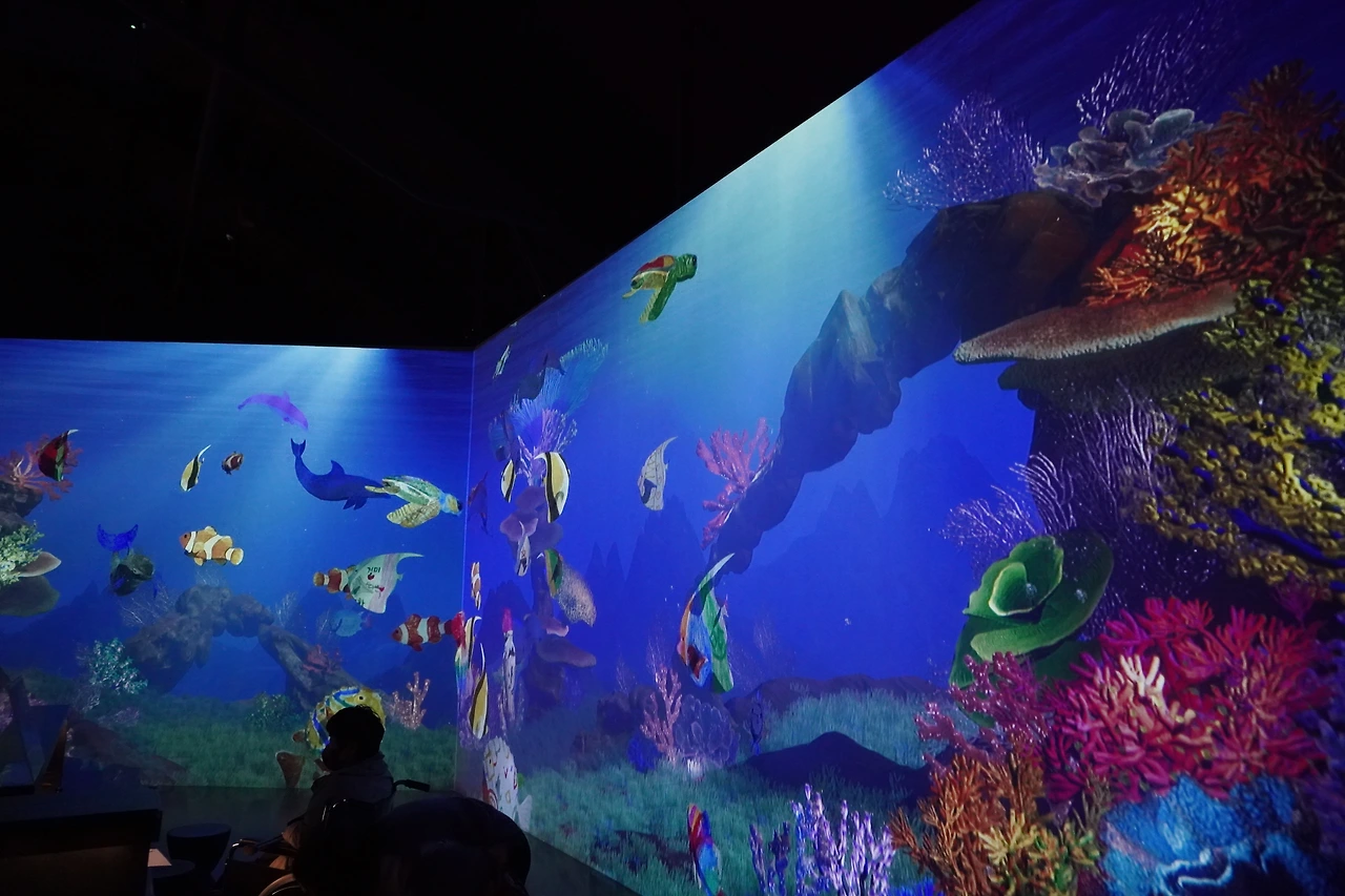 종이와 거울, 빛을 활용해 반짝이는 불빛들이 반짝이는 하늘의 별을 닮았다. 빛을 이용해 만들어낸 그림자 실루엣은 핑크라군이라는 작품이고, 내가 그린 바닷속 생물들의 그림들이 유유히 헤엄치는 것을 볼 수 있는 LIVE SKECHBOOK이라는 작품까지. 나는 가오리 한 마리를 바다로 보냈는데 그 가오리가 스크린에 나타나자 동심으로 돌아간 듯 까르르 웃고 있었다. 신비로운 경험들의 연속이다.