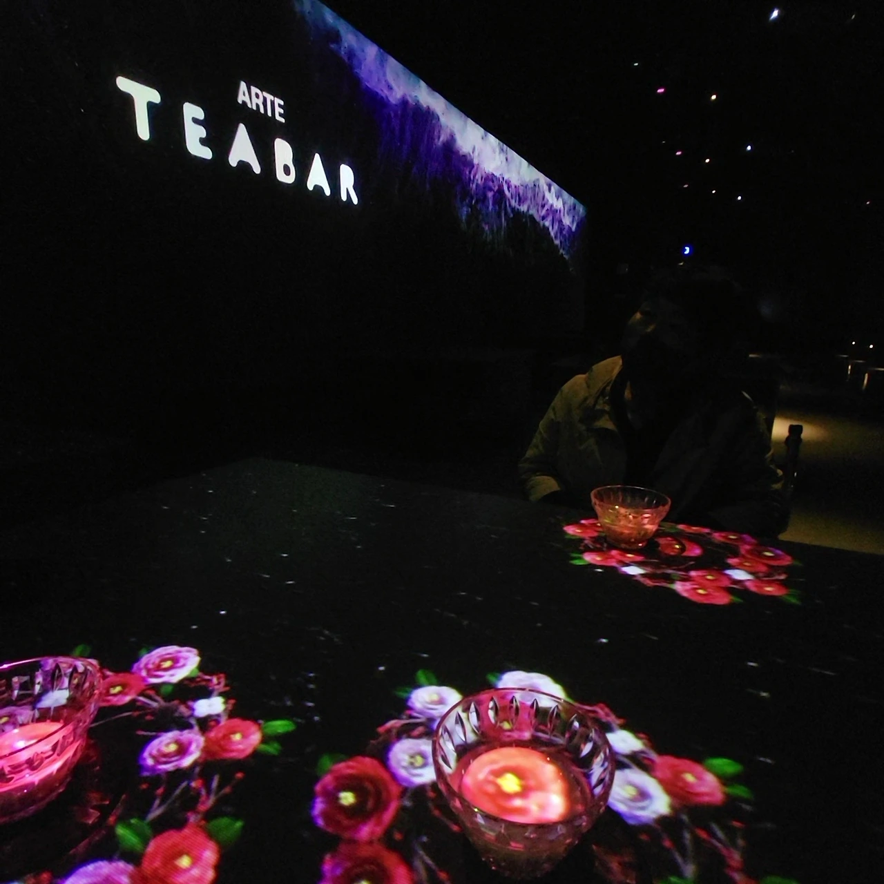 그리고 밀크티 한 잔까지. 잔을 테이블에 놓으면 음료 위에 동백꽃이 맺히고 그 주변으로도 꽃이 피는 작품을 볼 수 있다. 액체만 인식하는건지 밀크티를 다 마시고 잔을 내려놓으니 더 이상 꽃이 피지 않았다.