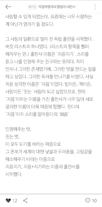 P.S. 여러 모로 부러워지는 책이었다. 글을 쓰는 모든 이들은 자기 책을 내는 것이 꿈일 것이다. 용기 있는 도전으로 출판사를 설립하고, 자신이 만든 출판사에서 자신의 책을 낸다는 것. 너무나도 멋지고 황홀한 경험이 아닐까. 너무 부럽고, 꼭 잘돼서 좋은 선례로 남길 진심으로 바라고 있다. :)