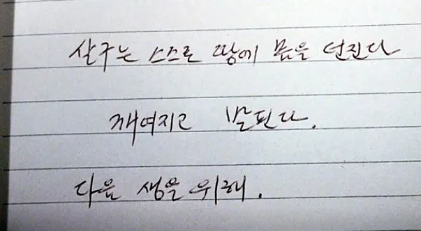 여러분, 시 어렵지요? 시는 이런 겁니다. 보물찾기 하듯 땅을 판다고 나오는 것도 아니고, 하늘 저 높이 있는 것도 아닙니다. 당신이 있는 자리 거기서 보는 거예요. 거기서 얻는 거라고요. 눈높이에 맞춰 흘려보낼 테니 잘 보십시오. 옆에 써줄게요. 보는 게 가장 중요합니다.