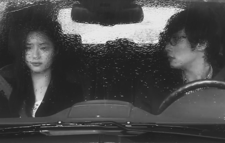 차가운 비가 내리는 도로 위, 두 사람의 눈빛이 마주친다.