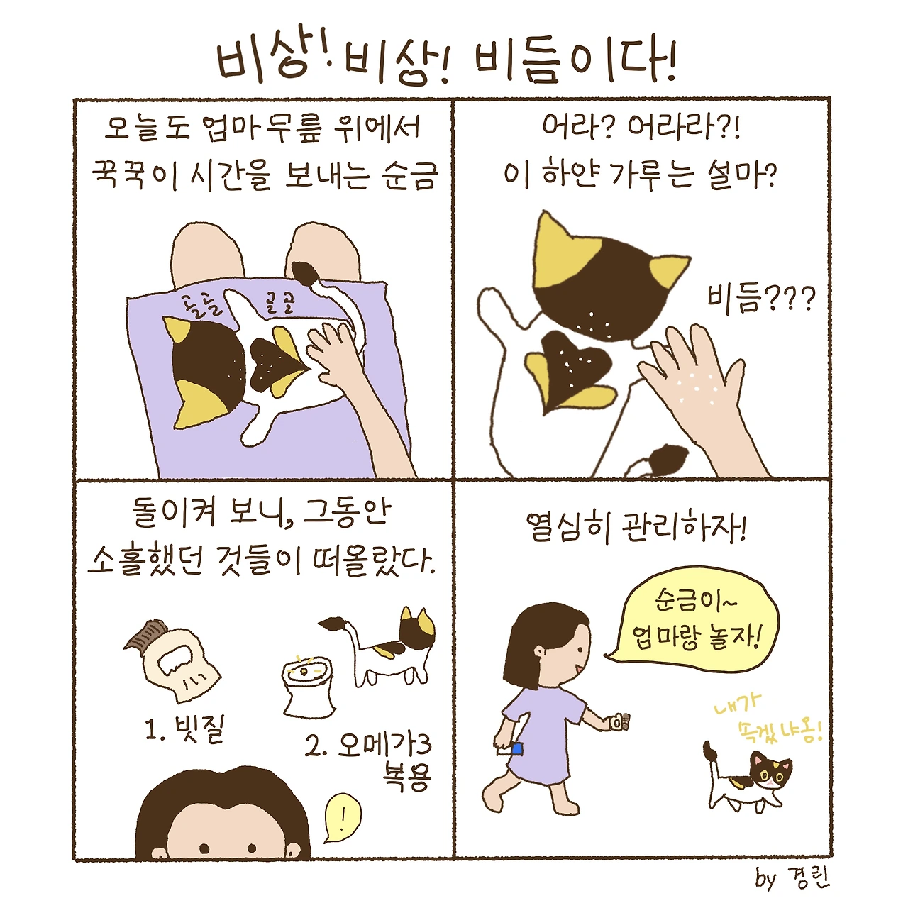 얼마 전 순금이에게 비듬이 생긴 걸 알게 되었다. 처음 우리 집에 왔을 때 비듬이 좀 나와 열심히 관리했던 게 떠올랐다. 고양이 관리의 시작은 빗질이다. 대부분의 고양이들은 그루밍을 열심히 한다지만 순금이는 잦은 미용의 후유증으로 그루밍에 소홀한 편이다(이건 전적으로 내 잘못이다). 그래서 빗질을 열심히 해 주어야 하는데 요즘 설렁설렁한 탓이었다. 확실하진 않지만 오메가3 미복용도 한몫했을 거 같다. 전에는 습식 사료에 넣어 주면 꼴깍 삼키던 순금이가 한 달 전부터 약만 남긴 채 사료를 먹었다.