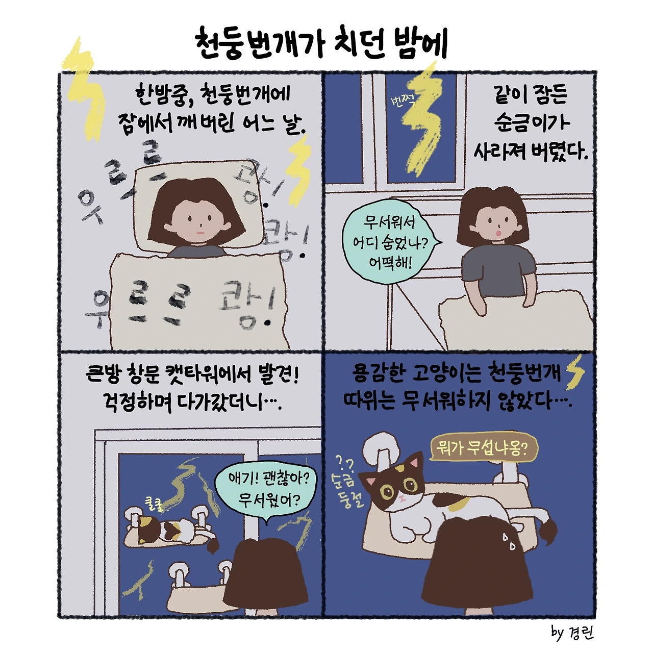 얼마 전 한밤중에 천둥번개로 인해 잠에서 깬 적이 있다. 순금이는 보통 침대에서 같이 자거나, 침대 옆 2층 스크래처에서 잠들곤 한다. 하지만 그날에는 순금이가 보이질 않았다. 침대에 앉아 순금이를 찾는 사이 또 한 번의 천둥이 치고 여러 번의 번개에 세상이 밝아졌다, 어두워졌다를 반복했다. 잠결인데도 순금이가 무서워서 어디 숨어 있진 않을까 걱정이 되어 자리에서 벌떡 일어났다.