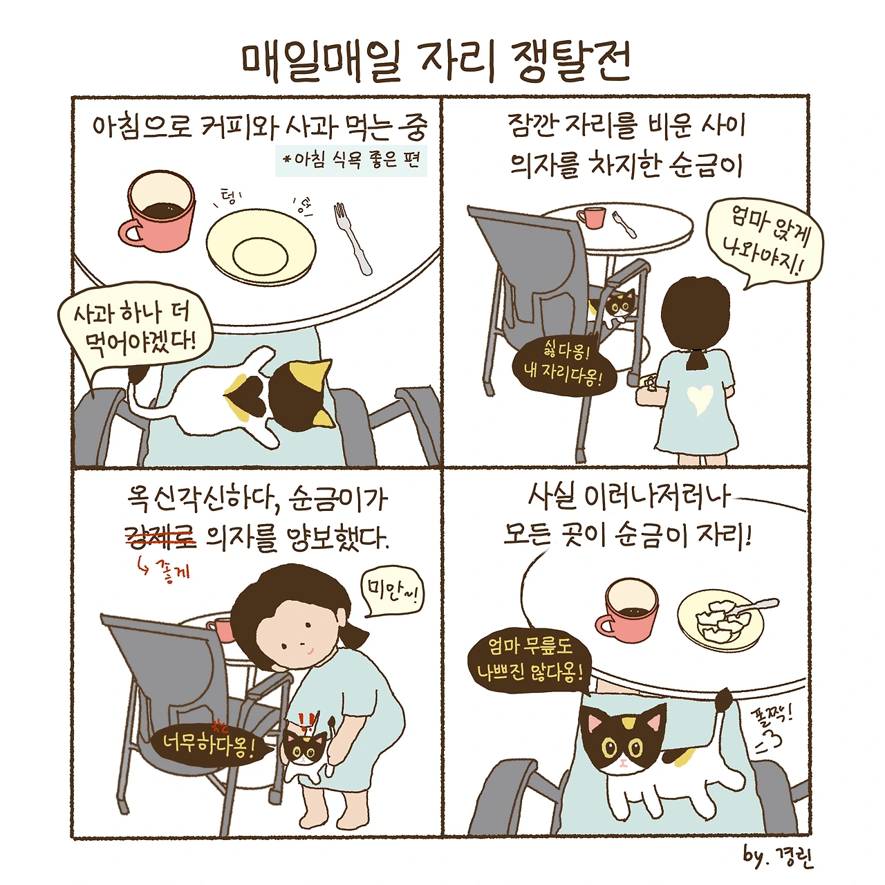 자리 쟁탈전이 이 시건에만 일어나는 건 아니다. 잘 시간이 되어 침대로 가면 내 베개에 올라타 있고, 좌식 소파에 앉아 있다 잠시 화장실이라도 다녀오면 순금이 차지가 된다.