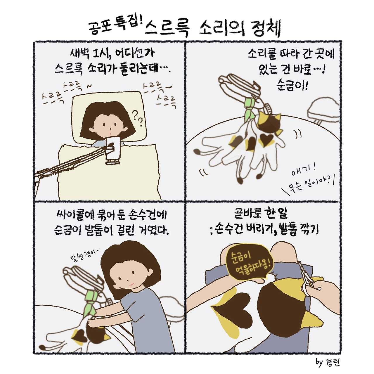 불과 며칠 전에 일어난 일이다. 보통 일찍 자는 편이지만, 쉬는 날 전날에는 오후에도 커피를 마시고 늦게 잠드는 편이다. 그날도 침대에 누워 유튜브를 보던 중이었다. 어디선가 ‘스르륵스르륵’ 소리가 들려왔다. 처음엔 순금이가 장난감을 끌고 다니는 소린 줄 알았다. 그런데 이 소리가 1분, 2분, 3분... 약 5분쯤 계속되니 이상했다.