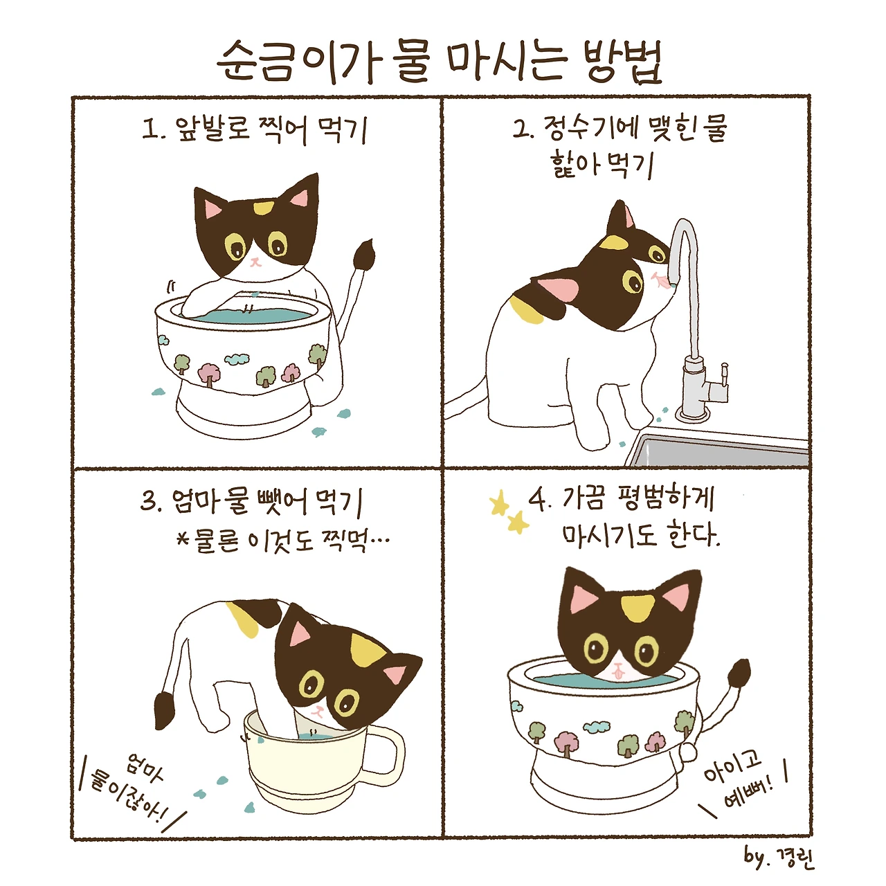 아마 처음부터였을 거다. 750g의 고양이는 물을 마실 때 꼭 앞발로 물을 찍어서 그걸 춥춥 마셨다. 나중에 유튜브로 알게 된 사실은 물의 깊이를 알기 위해 앞발을 담그는 거란다. 아무튼 이 버릇은 두 살이 다 되어 가는 순금이에게 아직도 남아 있다.