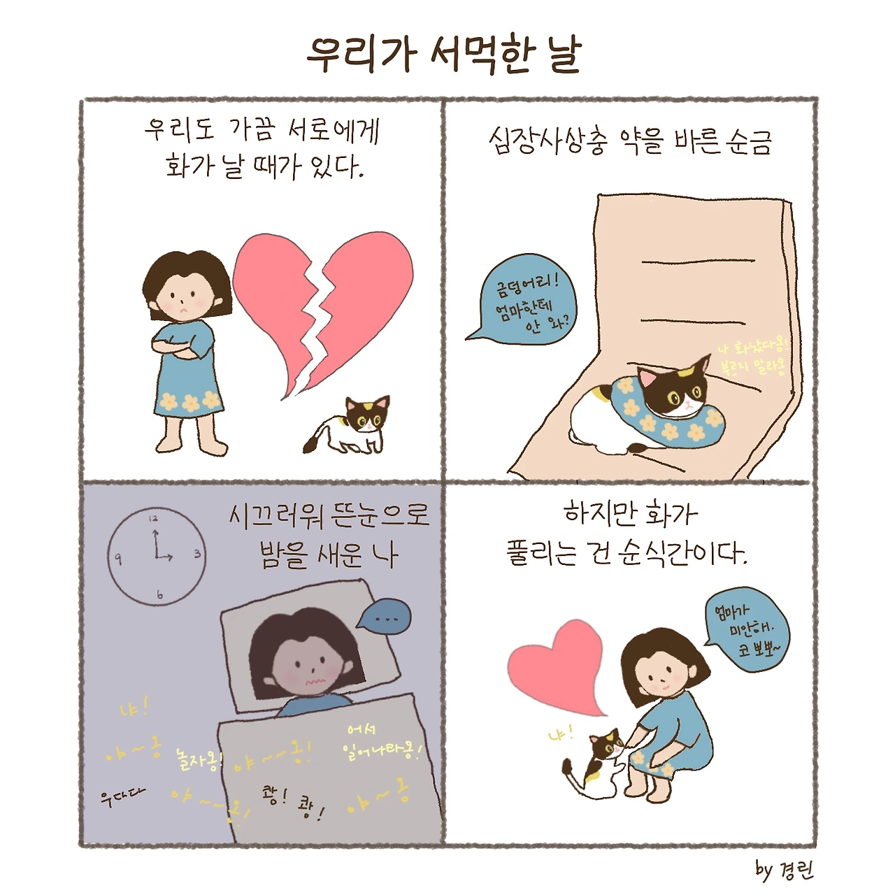 화해는 쉽다. 우리에겐 화해의 주문이 있다. 내가 근처에 가서 손끝만 뻗으면 순금이는 코 뽀뽀를 한다. 그 후엔 순금이가 평소처럼 변한다. 나도 화를 내다가도 순금이가 옆에서 “야옹” 하고 애처롭게 울면 웃음이 터져 버린다.