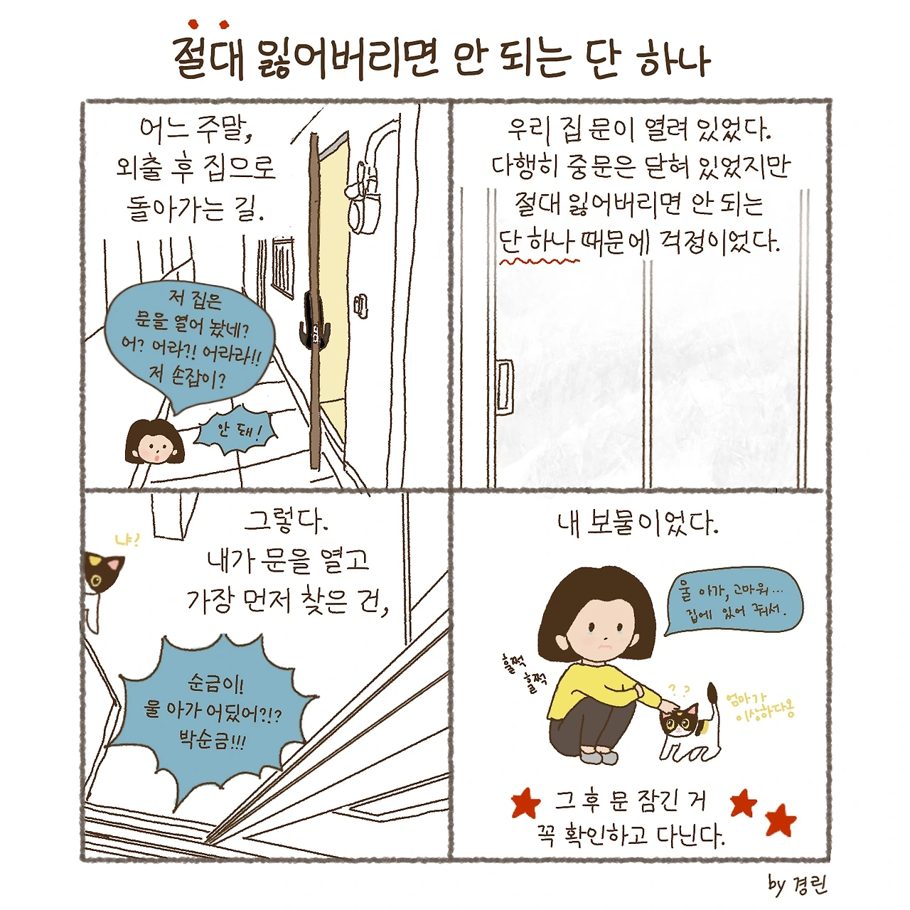 그러자 곧 “냐~” 하는 소리가 들려왔다. 침실에서 자고 있던 순금이가 내 소리에 뛰어나온 것이다. 나는 그제야 한숨을 돌릴 수 있었다. 순금이가 무사한 것을 확인한 후 난 스스로를 질책했다. 왜 문이 잠긴 걸 제대로 확인하지 않았을까? 왜 우산을 제대로 놓지 않았을까? 나는 그날 다른 잃어버린 것이 없는지는 확인하지도 않았던 것 같다. 그저 우산 걸이를 새로 샀으며, 그 후로 외출할 때 문이 잠겼는지 꼭 확인하고 다닌다.