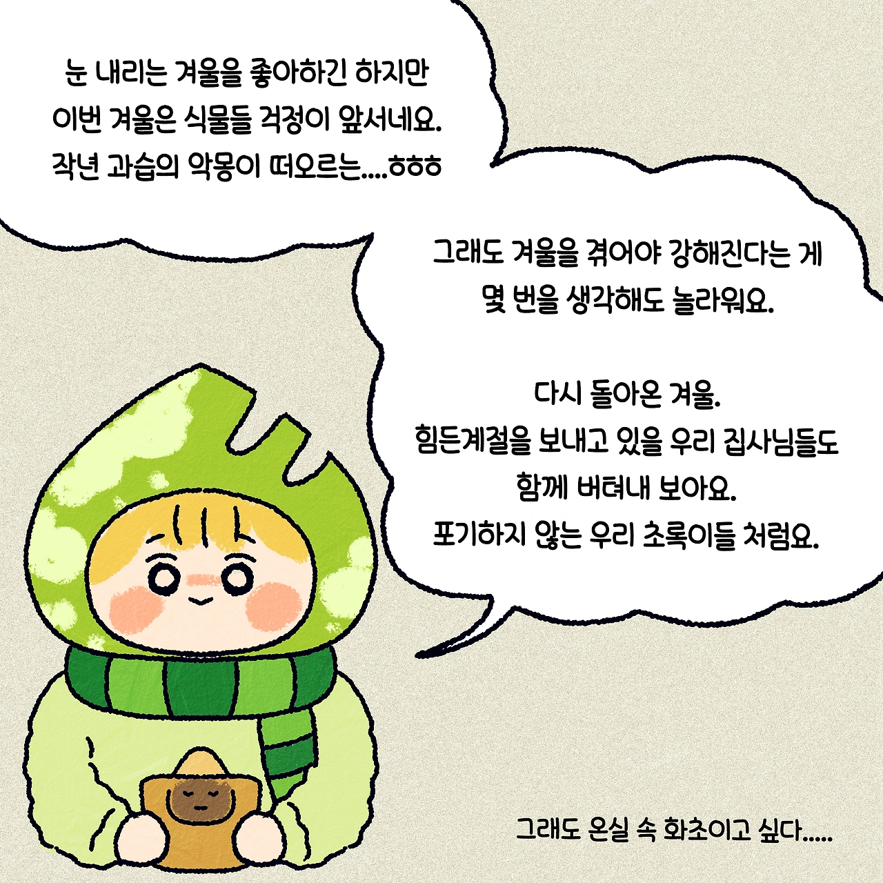 초보 식물 집사. 인생도 초보. 오늘도 조금 더 따뜻한 말 한 마디와 마음으로 나에게 물 주기를 합니다.