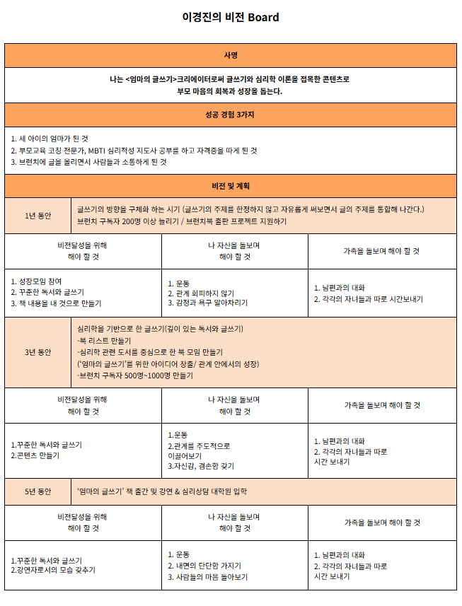MBTI 관련 자격증 공부를 하던 당시, 비전보드를 만들었다. 사명을 정하고 5년 안의 목표와 계획을 세우는 작업이었다. 나의 사명을 돌아보면 내가 가진 욕구가 무엇인가를 알 수 있을 것 같아 2022년도에 만들었던 비전보드를 오랜만에 꺼내 보았다.
